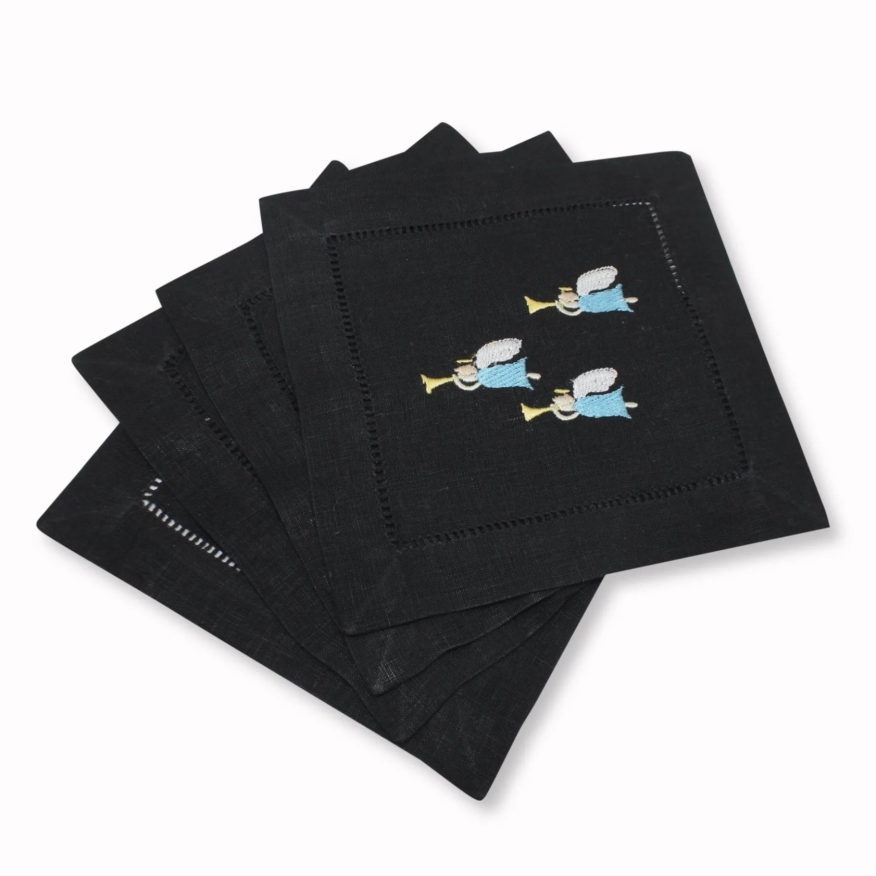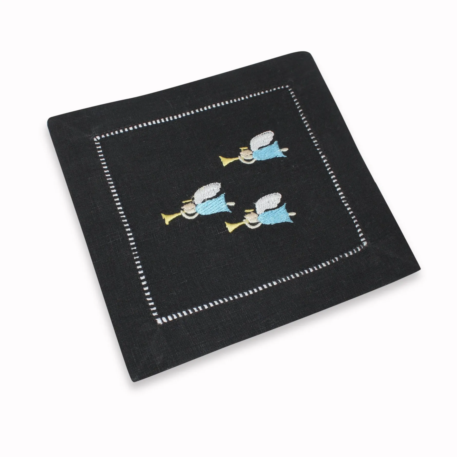 ‘Tis the season to have a cocktail in hand — and a corresponding cocktail napkin! By hand, we’ve embroidered angels on linen black cocktail napkins. It’s the ultimate cocktail napkin for your cocktail party!