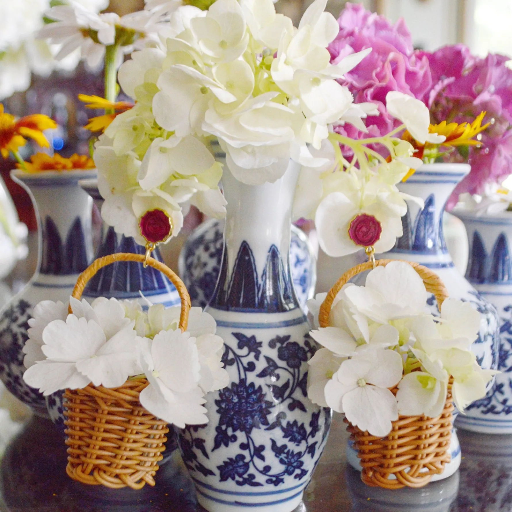 To match Chefanie’s iconic basket, we’ve created bold basket earrings to carry secret messages, chewing gum, or flower petals. The mini straw baskets hang from enamel clips inspired by Chefanie’s scalloped plate.