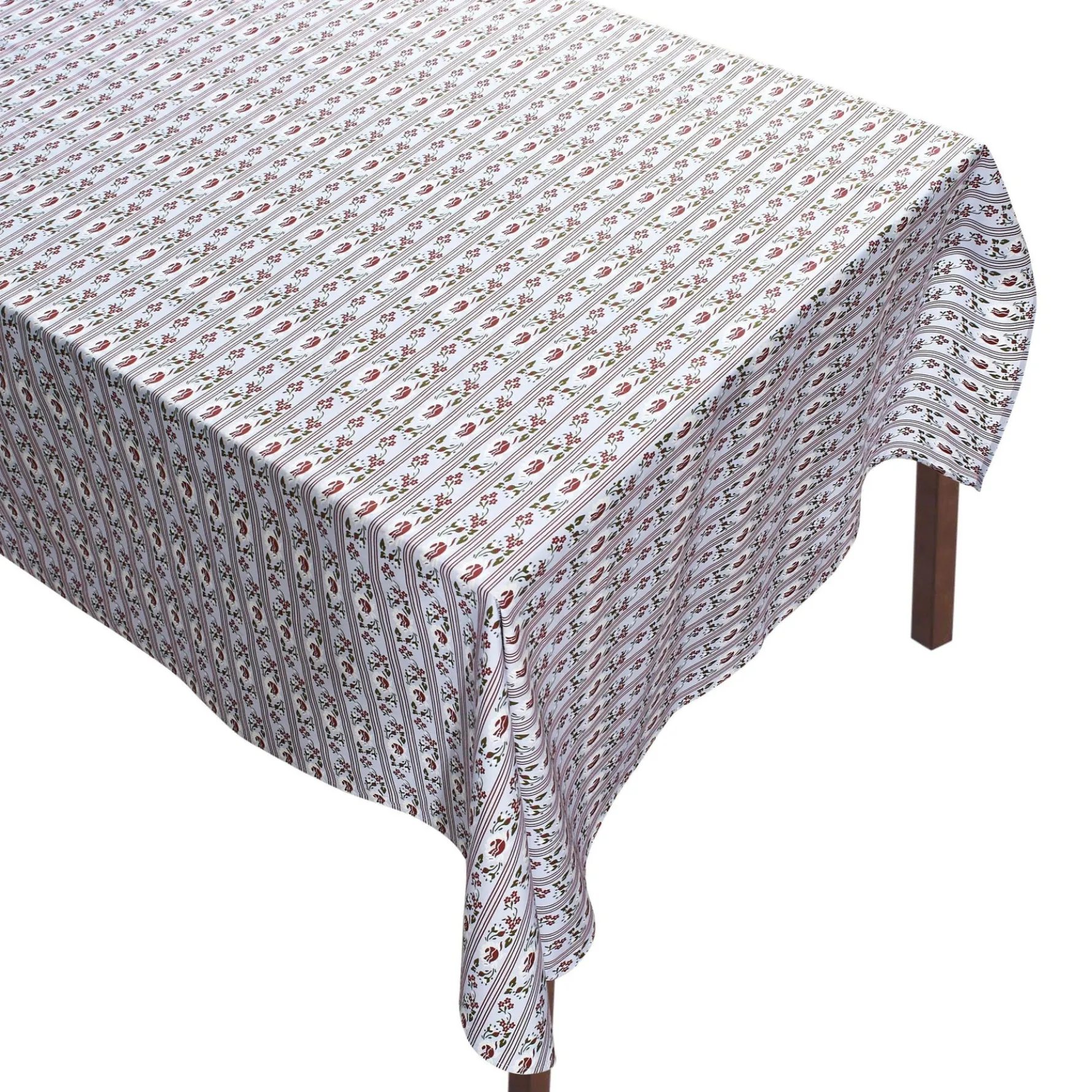 This sturdy rectangular tablecloth is patterned with long bands resembling charming ribbons