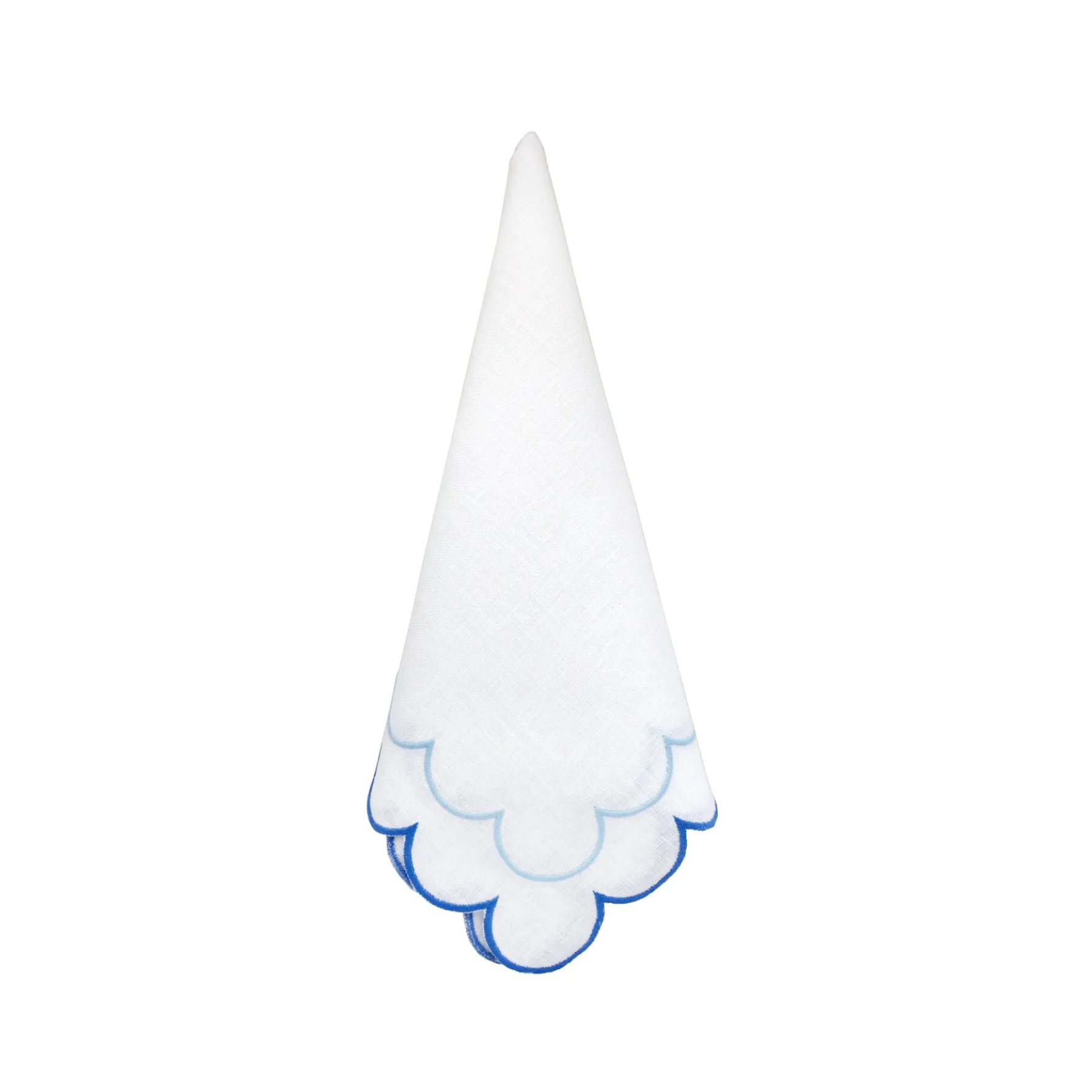 A set of dinner napkins featuring a timeless two-tone blue round scalloped edge