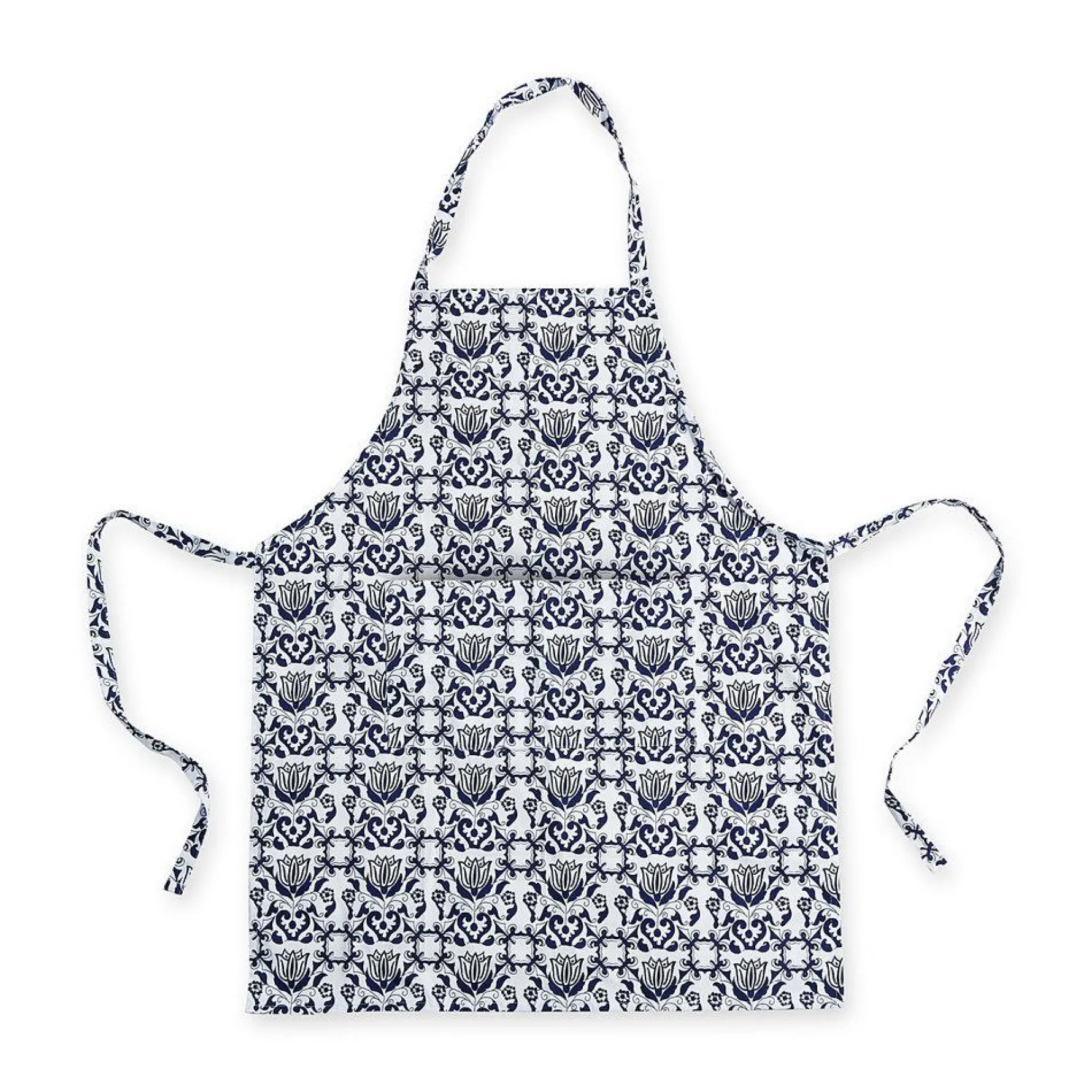 A patterned apron for a passionate cook! The bib is 30.5 inches tall and 24.5 inches wide. This blue and white apron complements a blue and white interior and tablescape