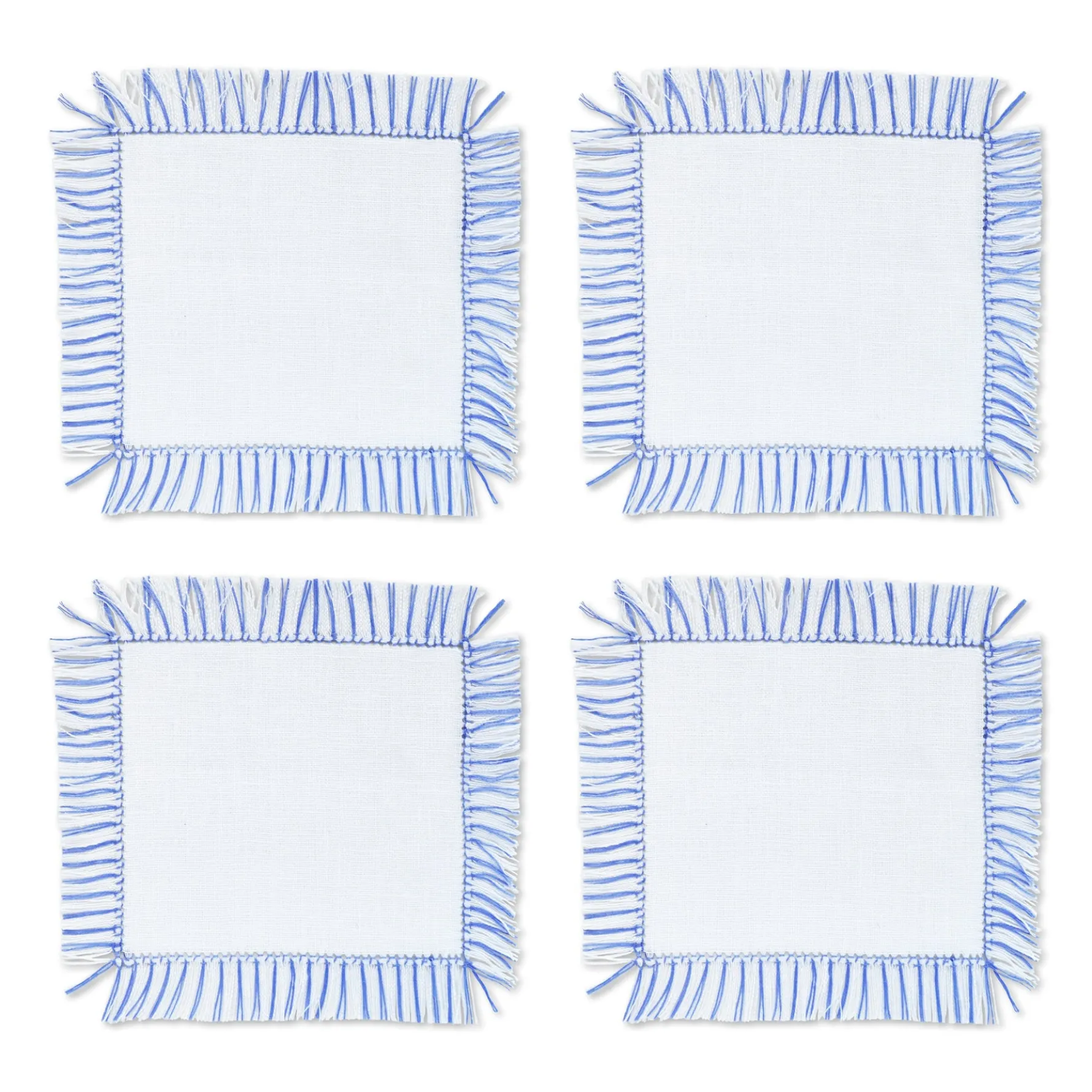 These blue and white fringed square cocktail napkins match so much of your existing china and add the perfect pizzazz to your barcart. The texture around the white linen square is novel but timeless.