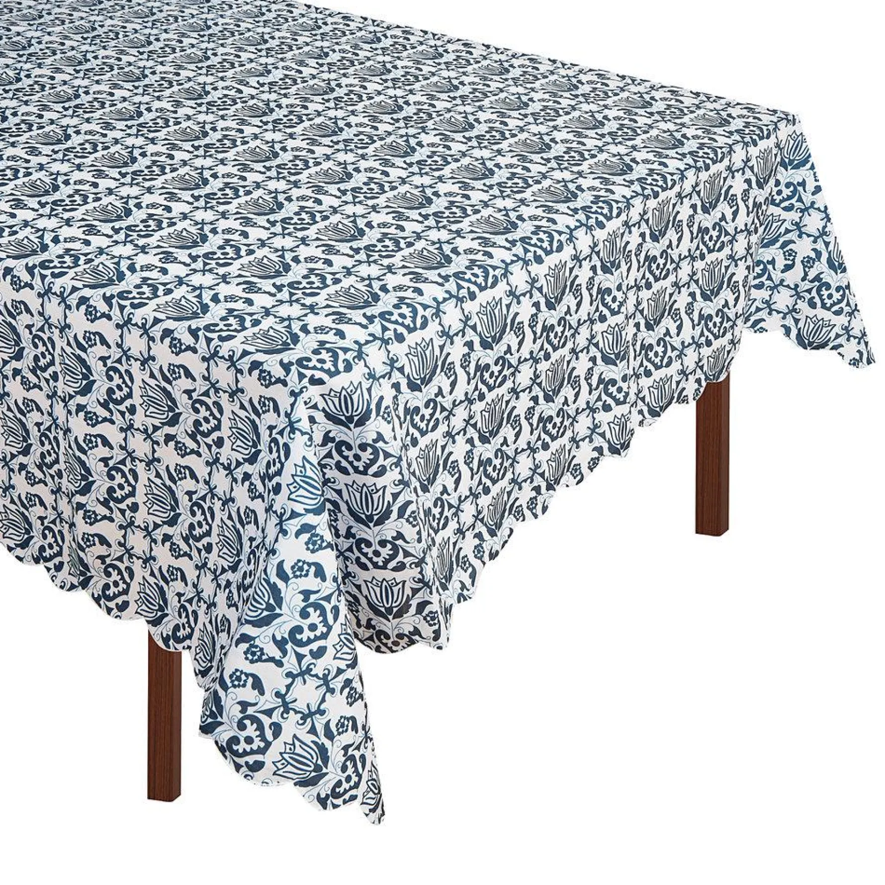 This blue & white, scalloped edge tablecloth is one for all seasons.