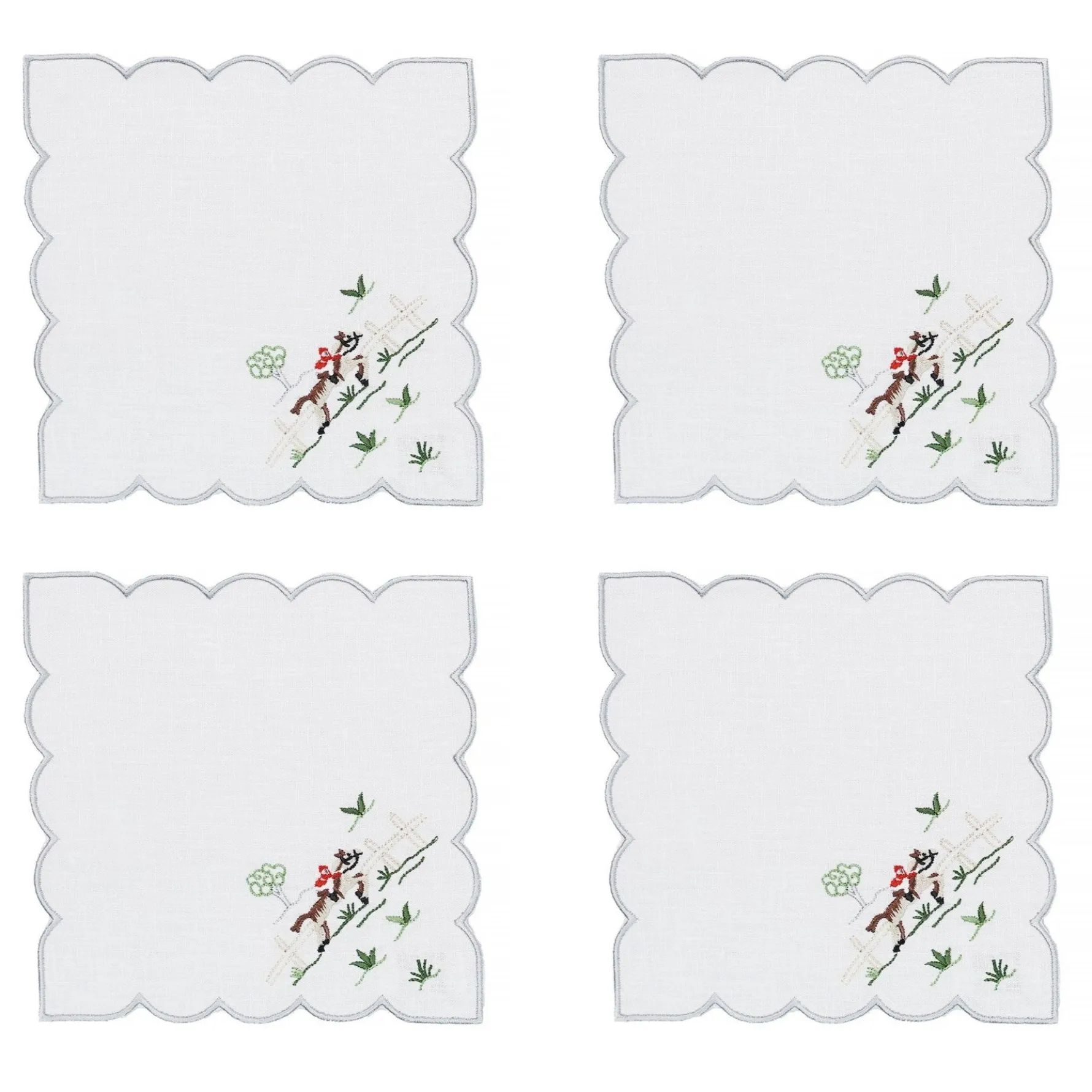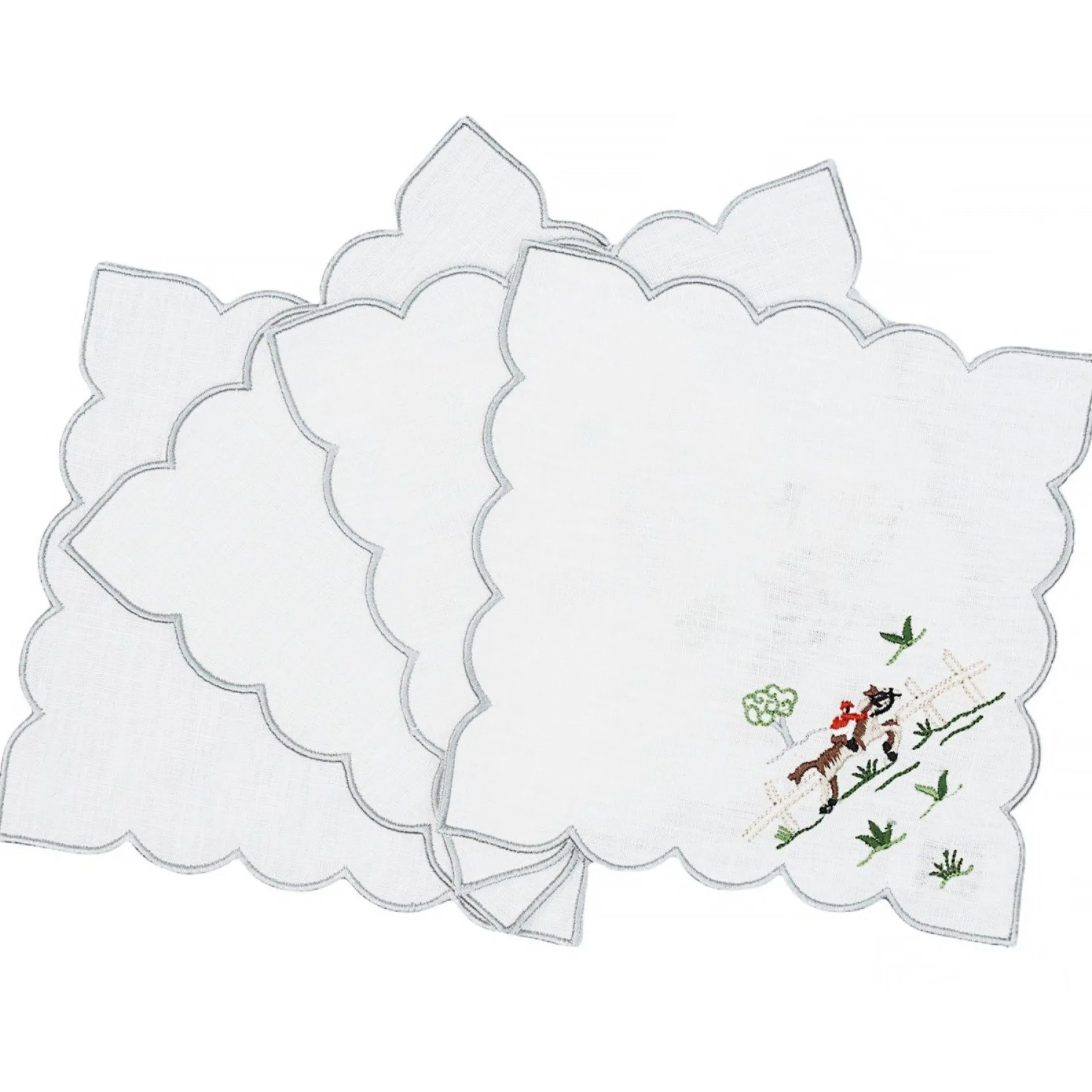 Inspired by a lost Madeira embroidery, this cocktail napkin shows a rider jumping on horseback.