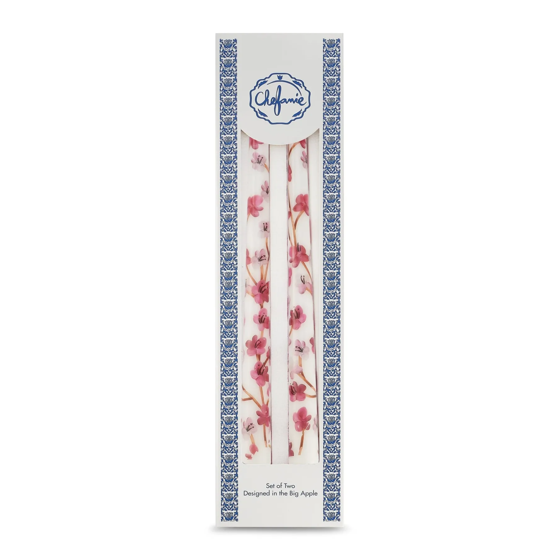 This set of 2 unscented taper candles is decorated with a motif of pink cherry blossom branches.