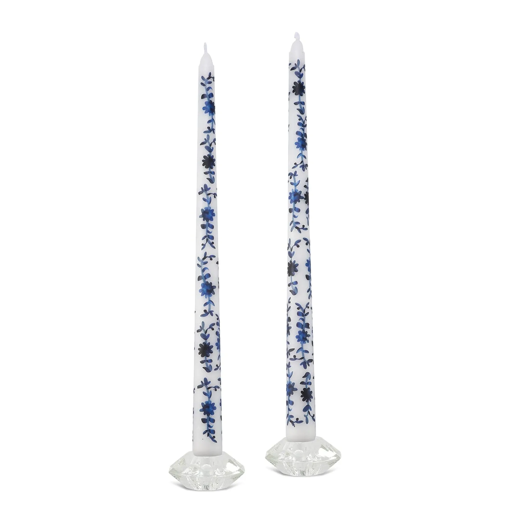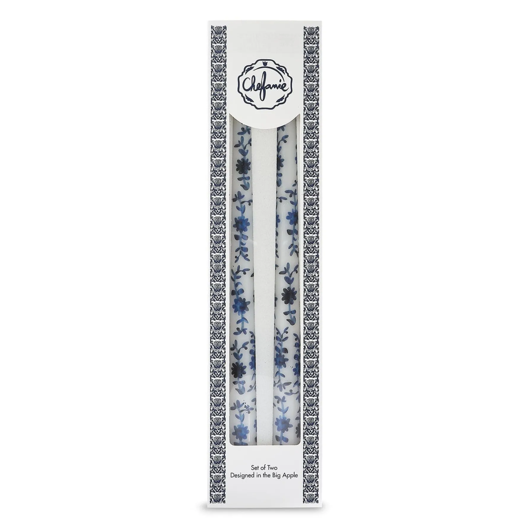 This set of 2 unscented taper candles is decorated with a blue chinoiserie motif — that you might otherwise find on blue & white porcelain.