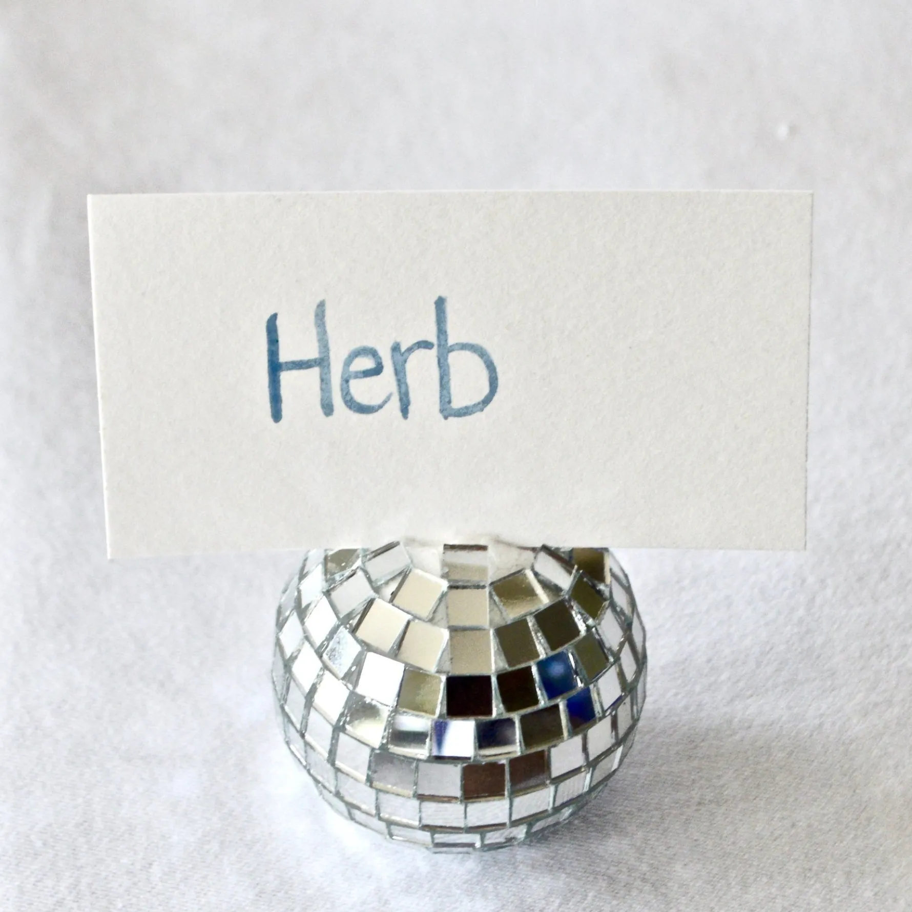 These miniature disco ball placecard holders will perch your guests’ names. As they are made by hand, there may be slight variations across balls.