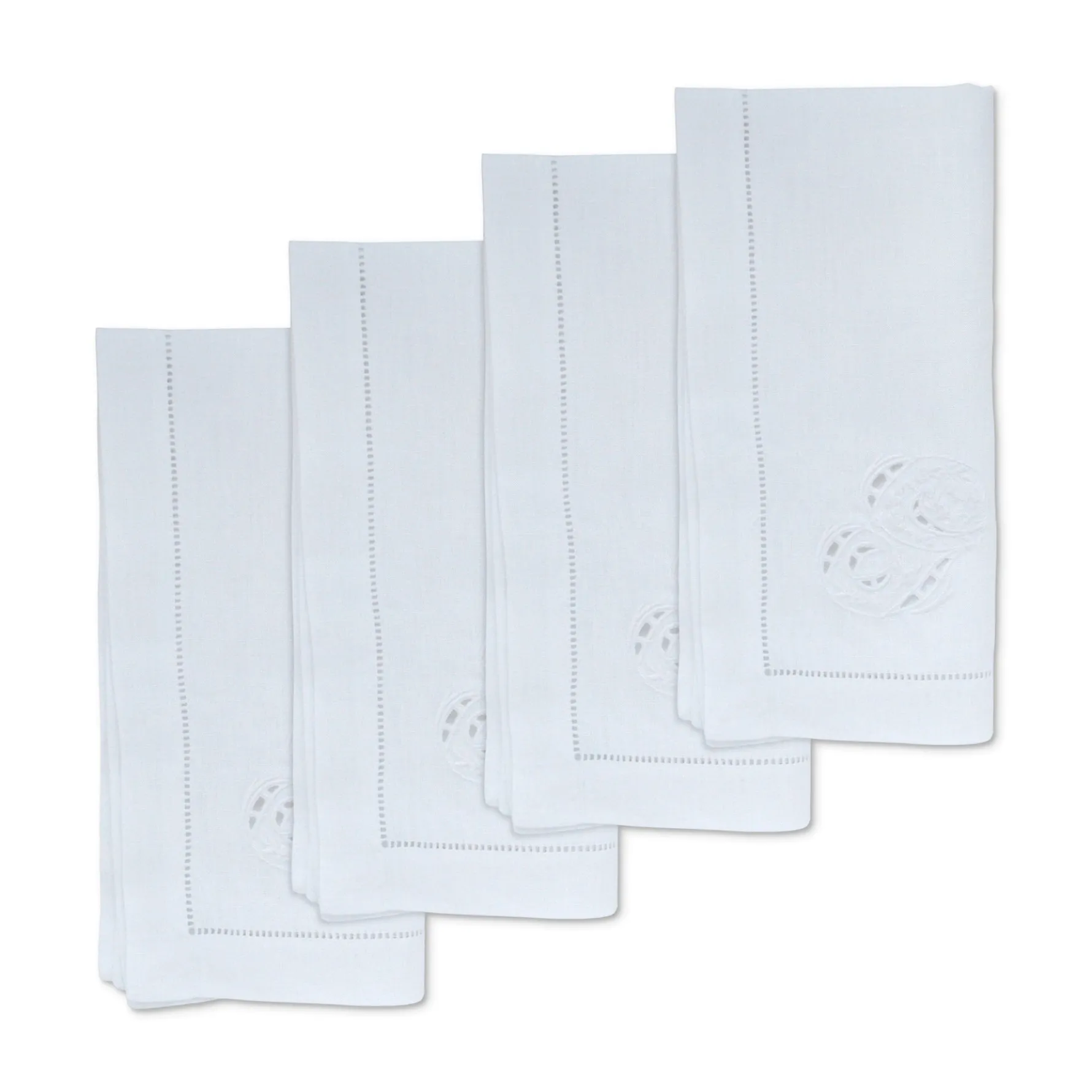 These “G” initial dinner napkins bring the perfect personal touch to your dinner table. The lowercase letter is discreetly embroidered with in the timeless cutwork technique, which creates holes in the linen as decoration. Beautiful for everyday use, springtime, & birthday celebrations.