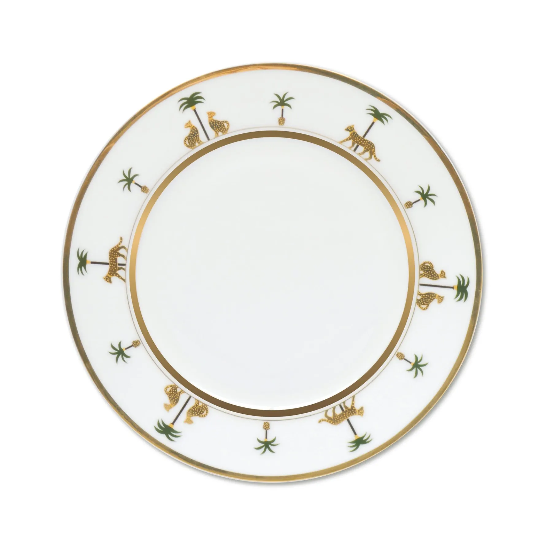White bone china plate embellished withrim decorated with leopardsand palm trees. Lovely forformal dining, weddings, gatherings, and any event of choice.
