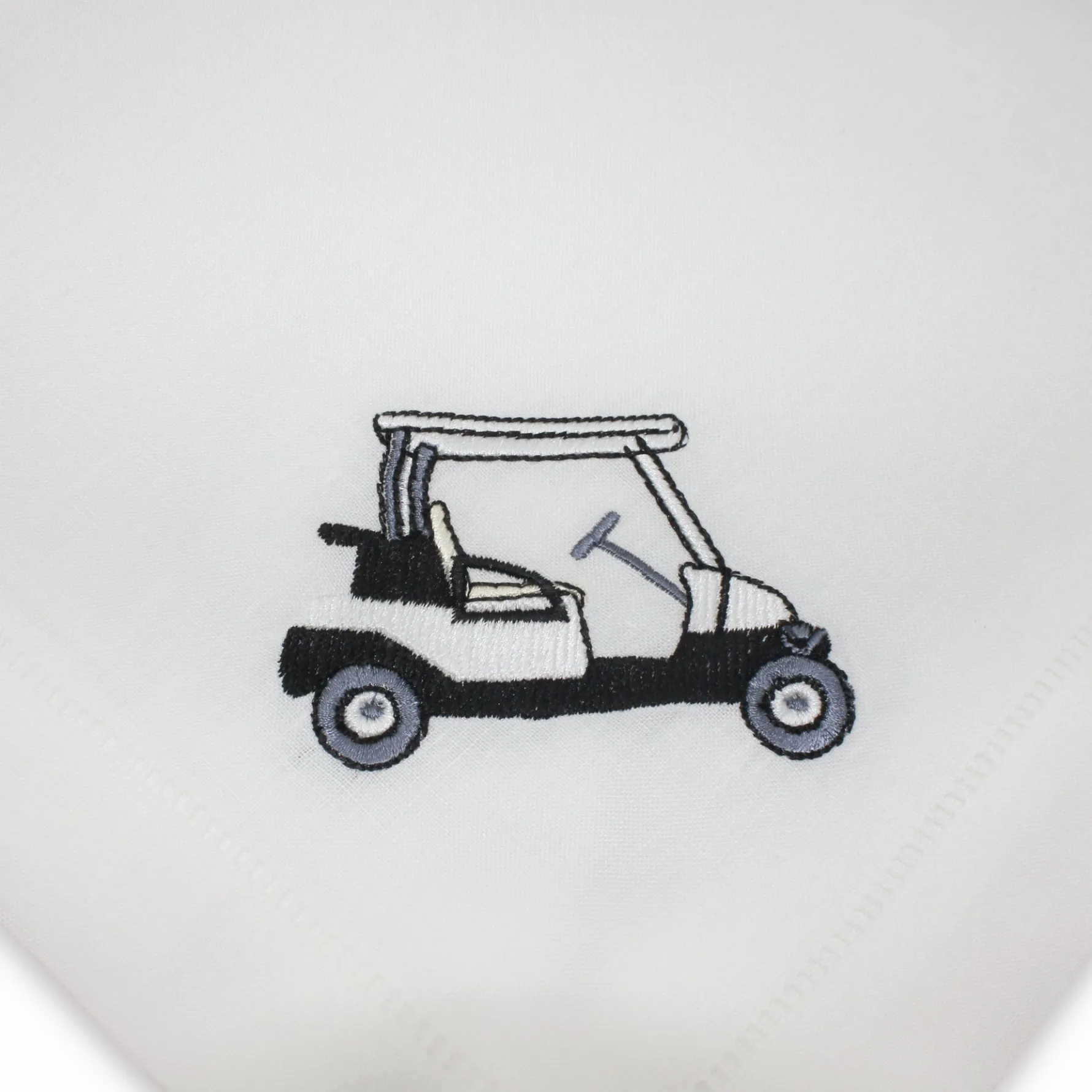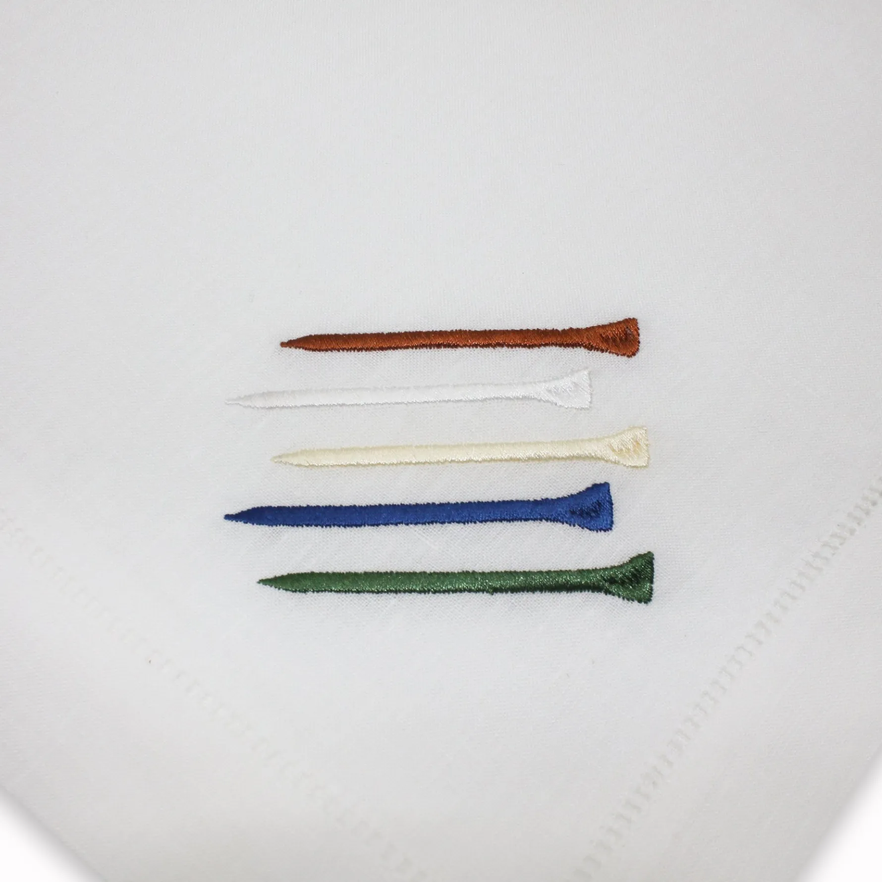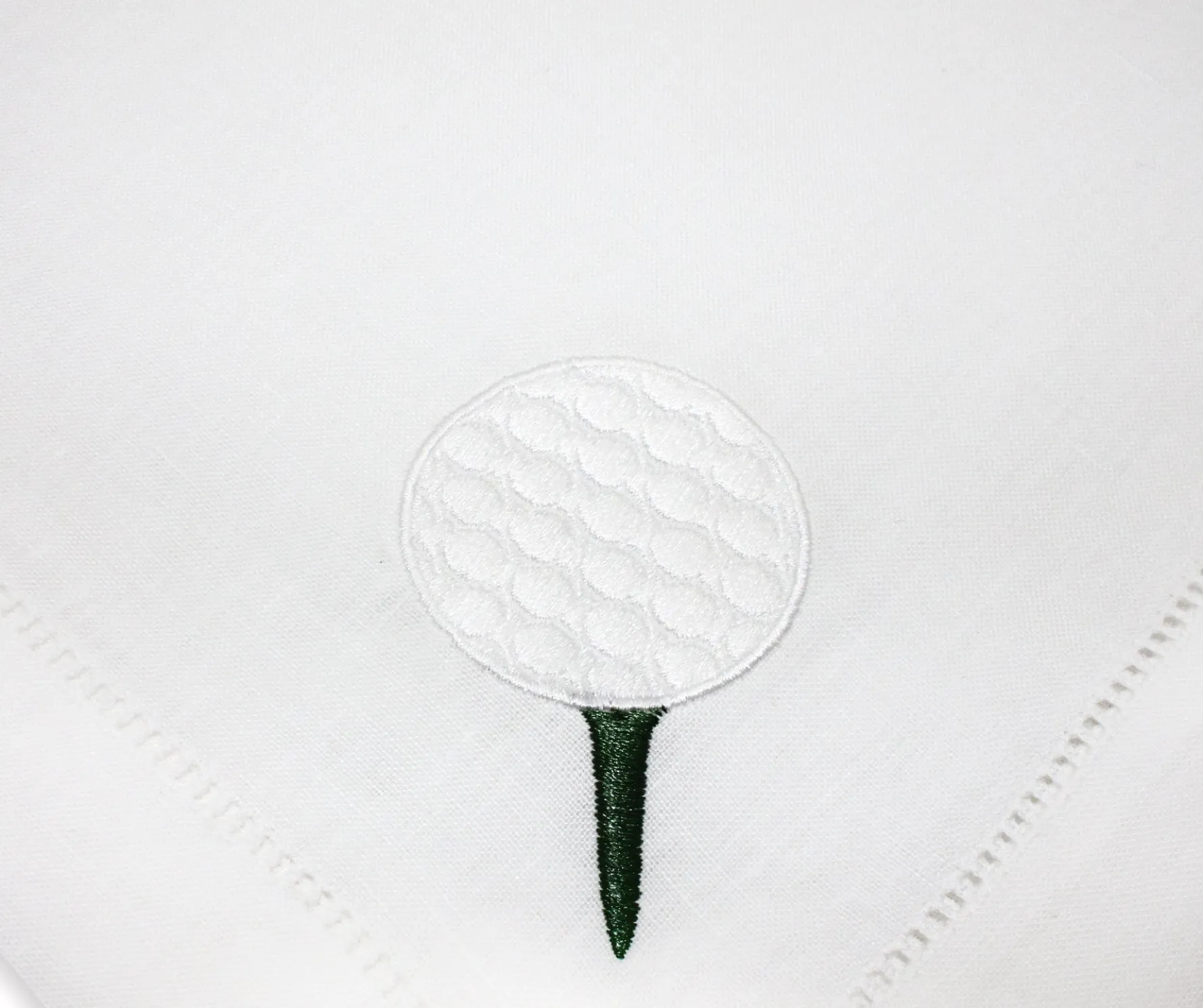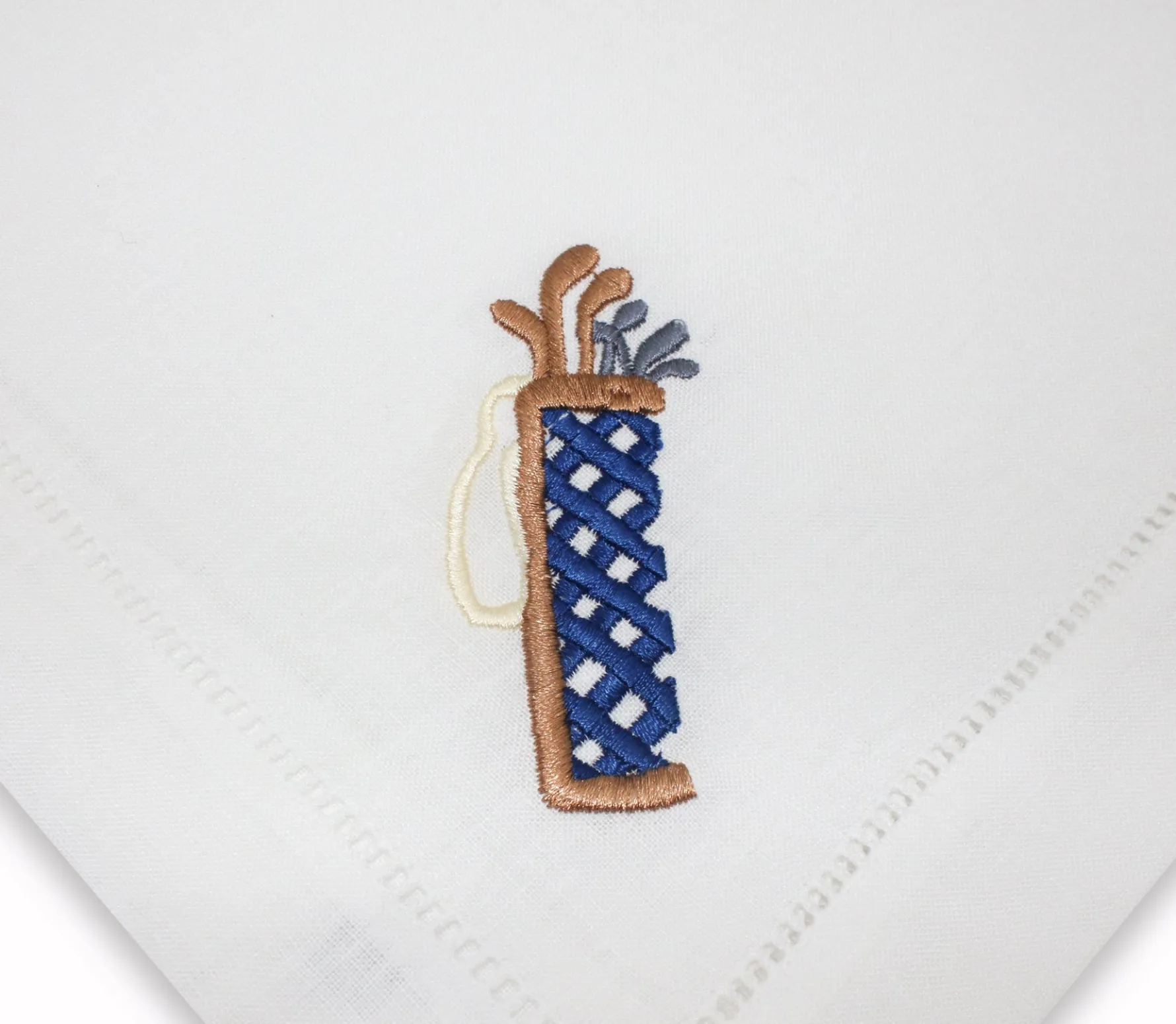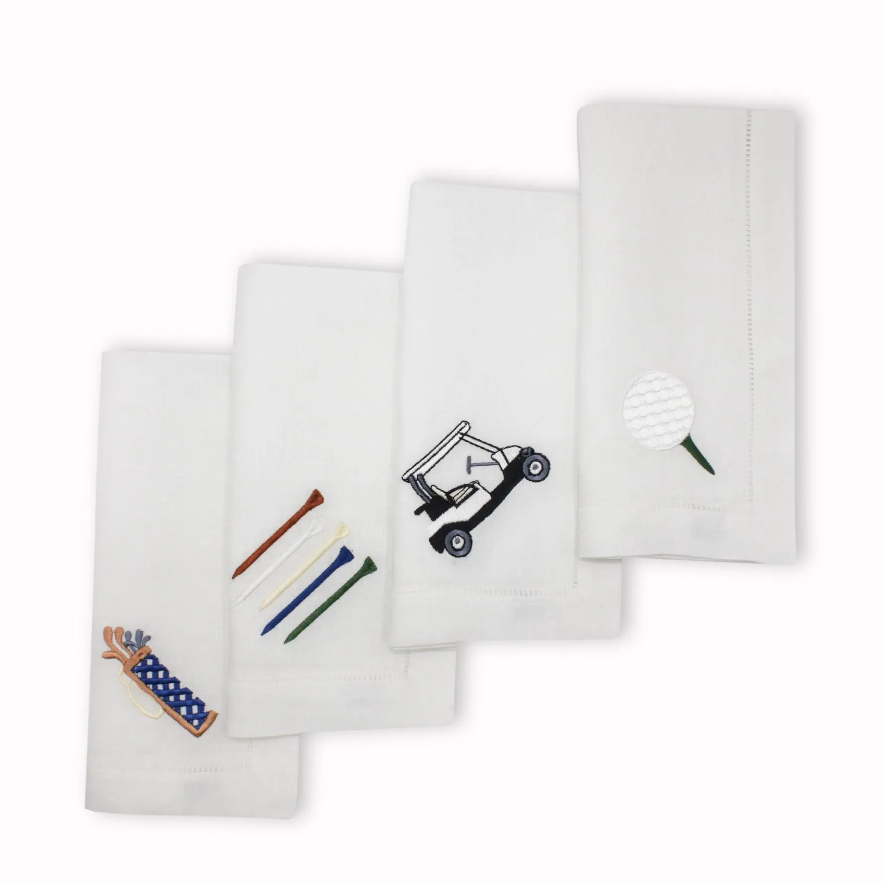 A napkin set for the golf fanatic. Each of these four napkins depicts a different element of this sport: the golf ball on the tee, golf bag, golf cart, golf tees.
