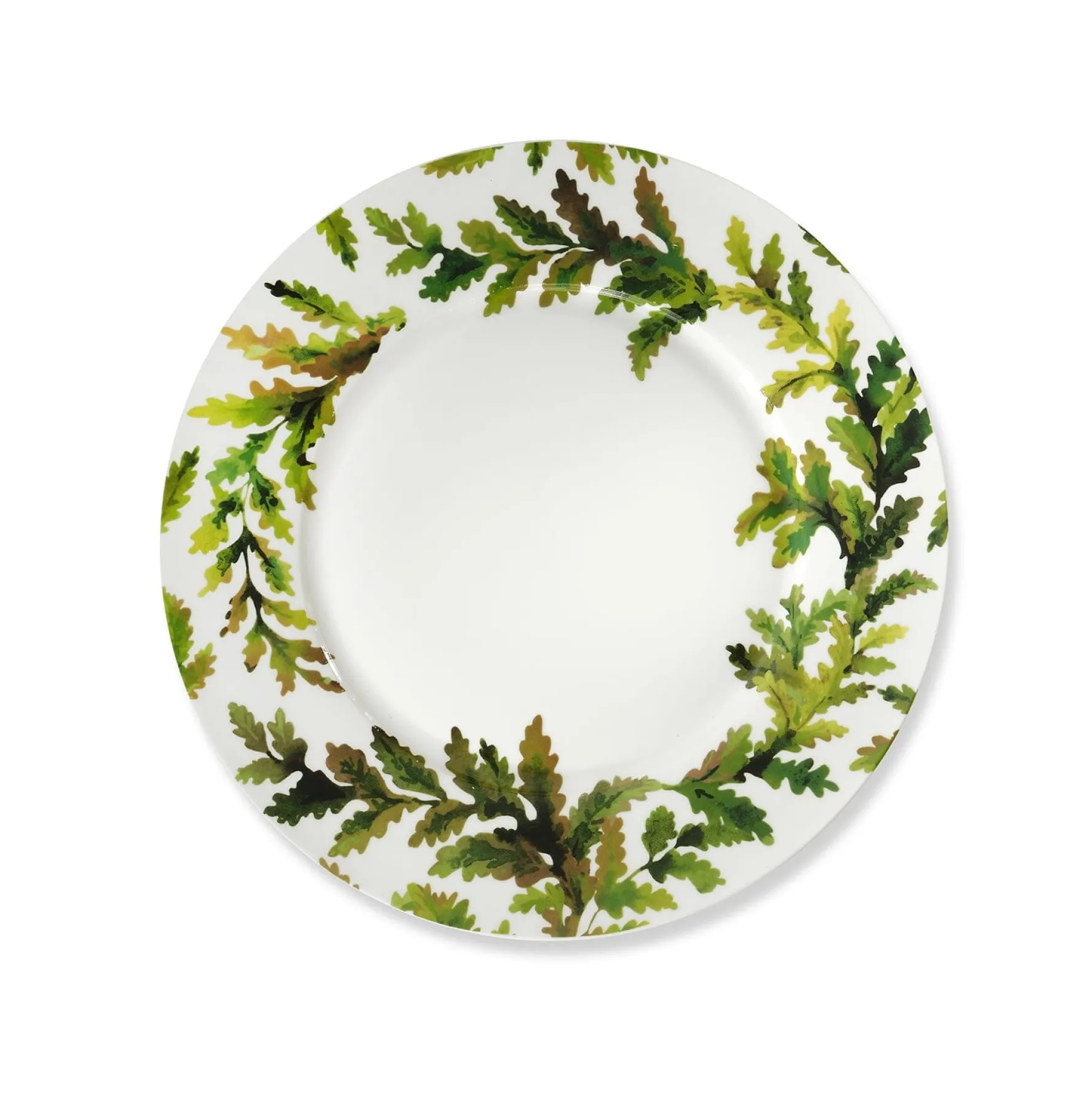 Lovely white bone china plate embellished with green leaves perfect for Thanksgiving, weddings, and birthday gatherings.