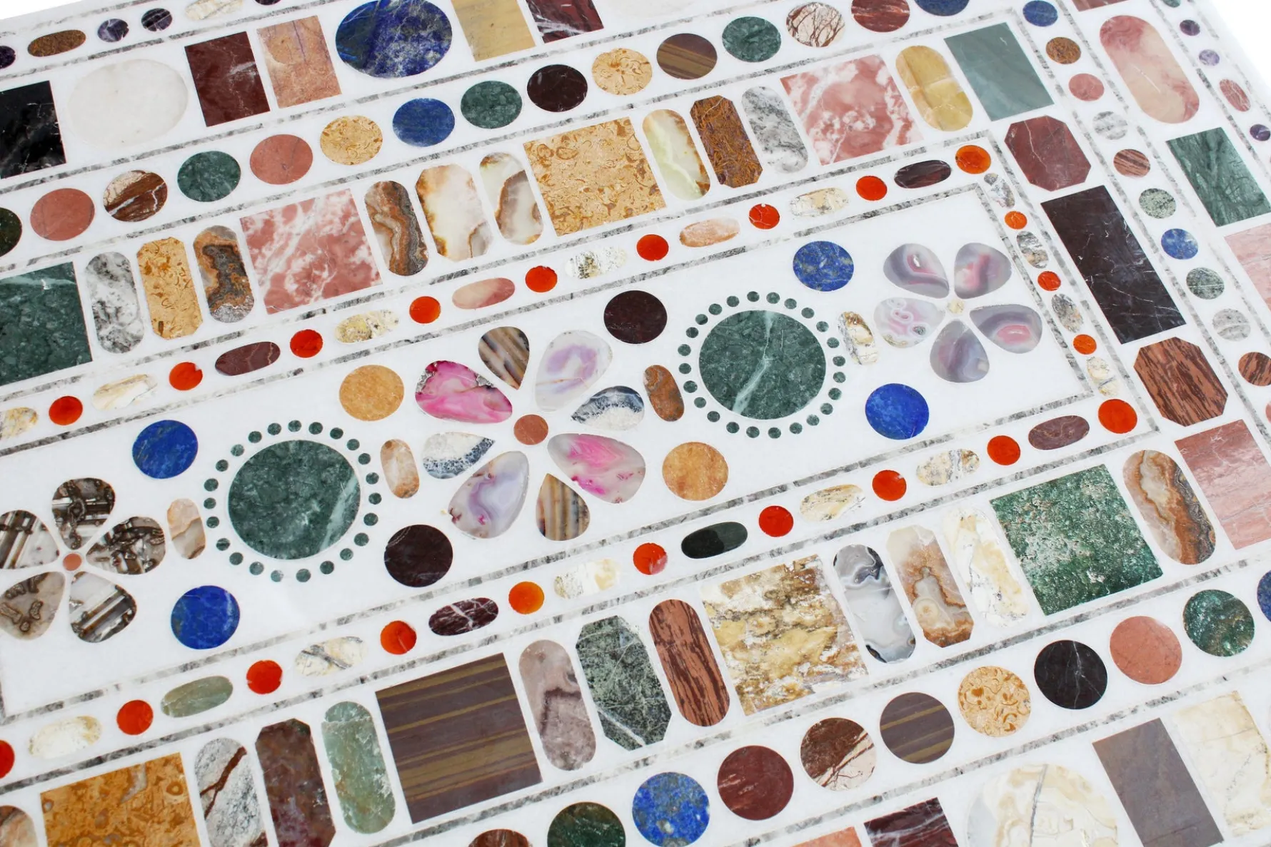 The perfect surface for aperitivo, coffee, or tea, this geometric marble tabletop iscarved by hand with precious stones.