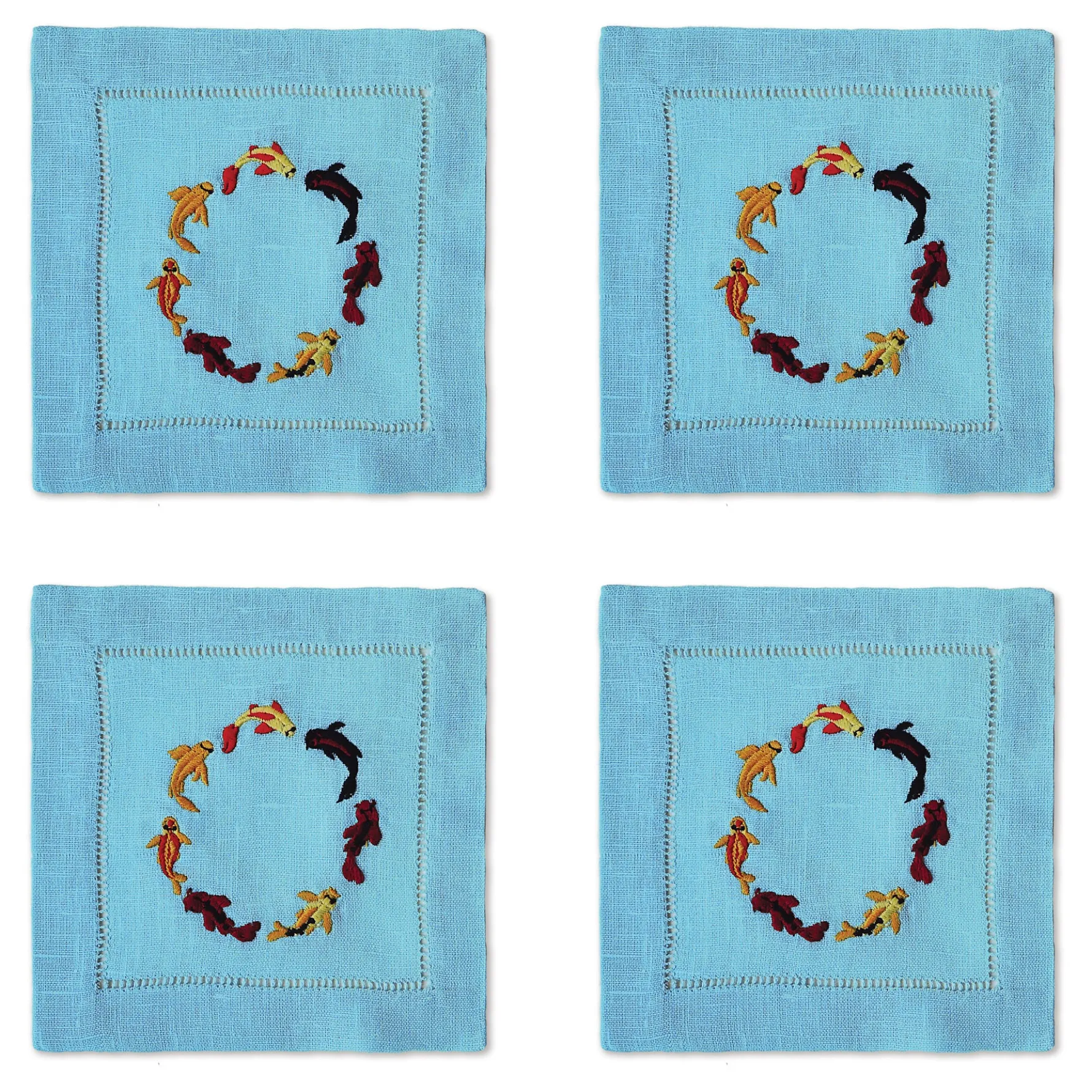 Square napkins are embroidered with colorful koi fish, as if you’re seeing them swim from above.