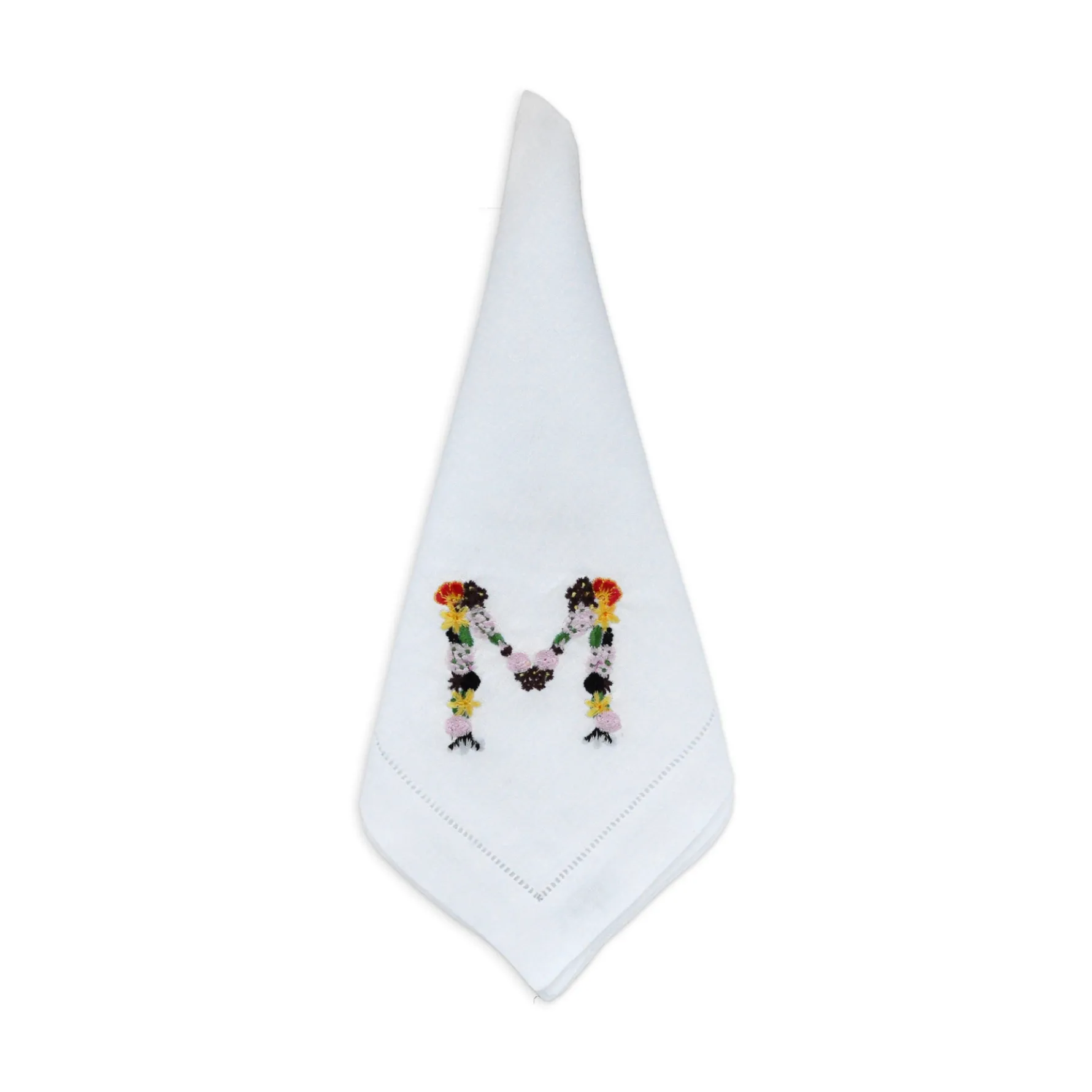 These “M” initial dinner napkins bring the perfect personal touch to your dinner table. The letter is ornately embroidered with colorful florals. Beautiful for everyday use, springtime, & birthday celebrations.