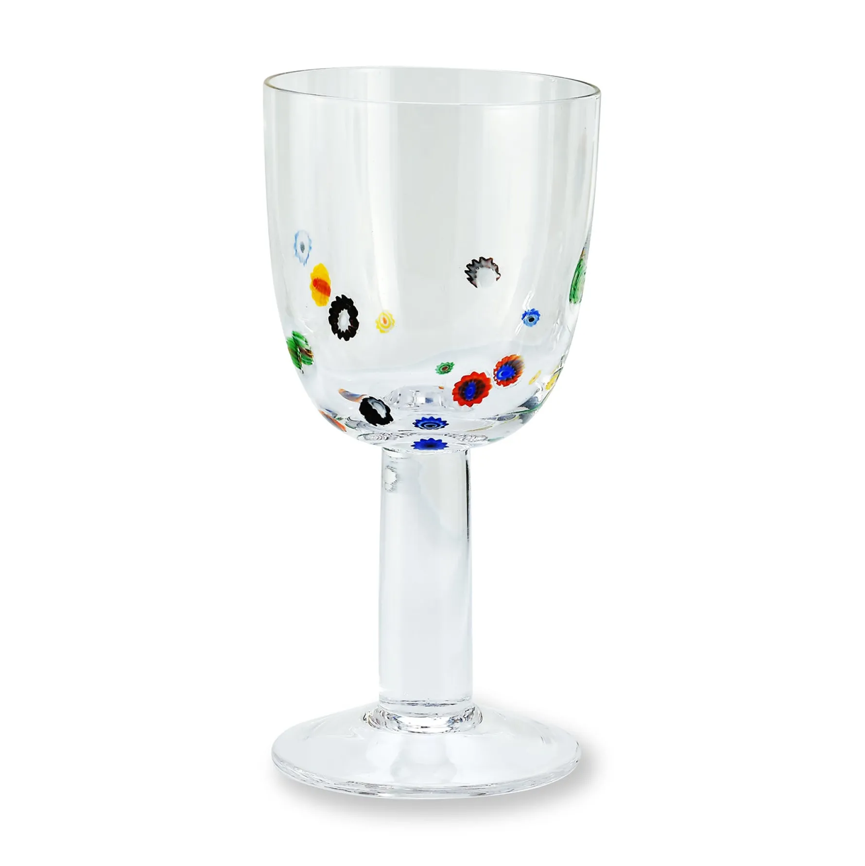 In the Murano glass style, this wine glass has little millefiori motifs for wine, water, and other beverages.