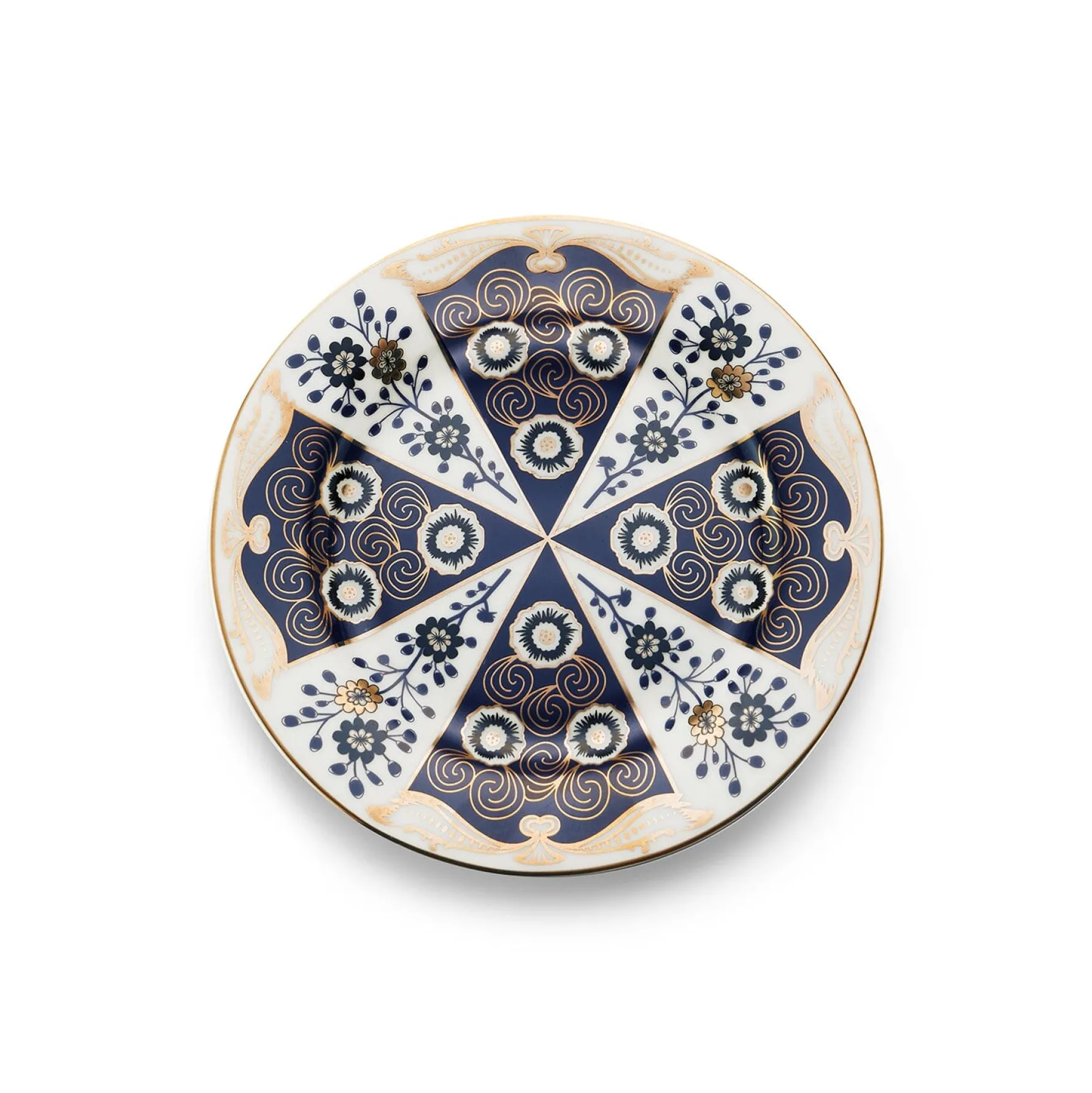 Blue, black, and gold decorated bone china plate perfect for Thanksgiving and other festive events. It has the gravitas to endure as an heirloom