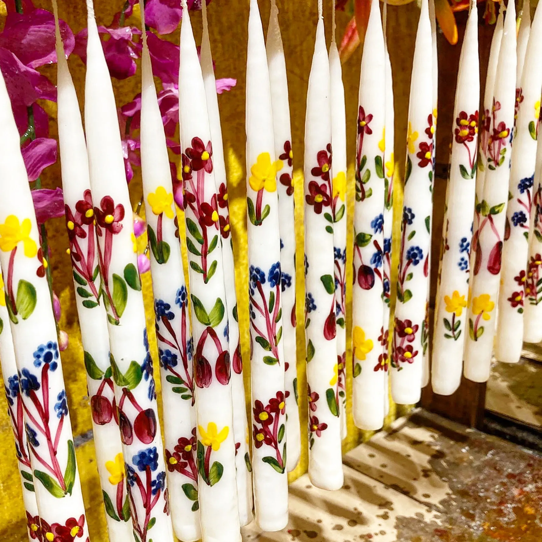 This set of 2 unscented taper candles is painted by hand. The motif is purple, blue, yellow, and brown flowers and fruit.
