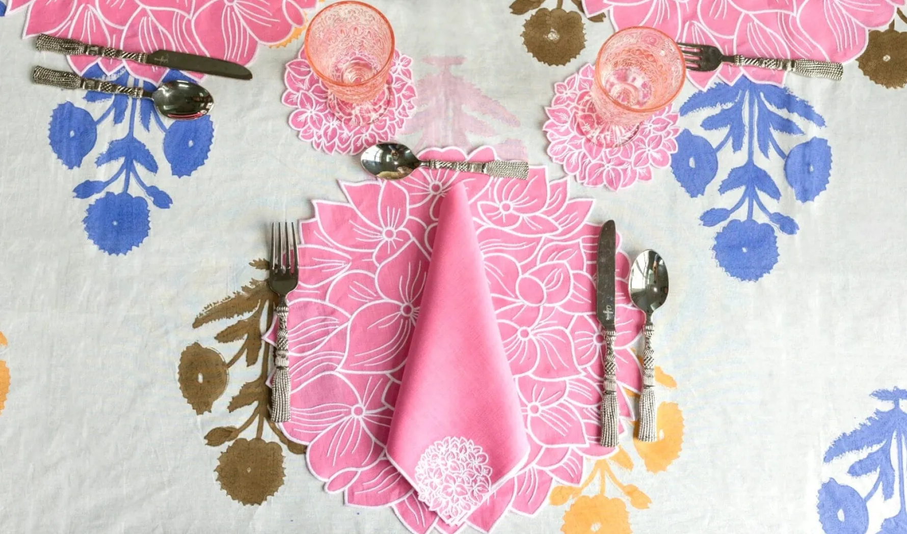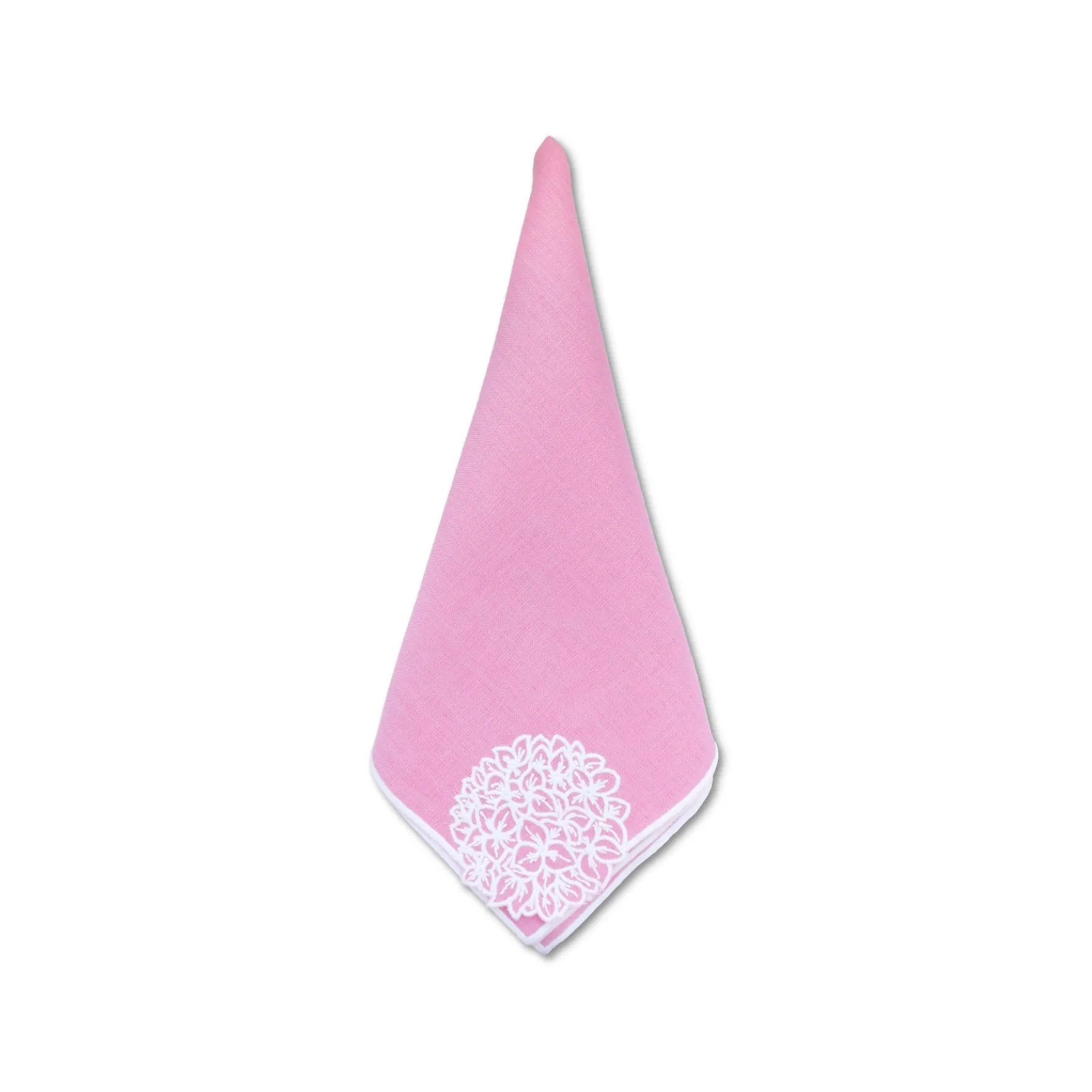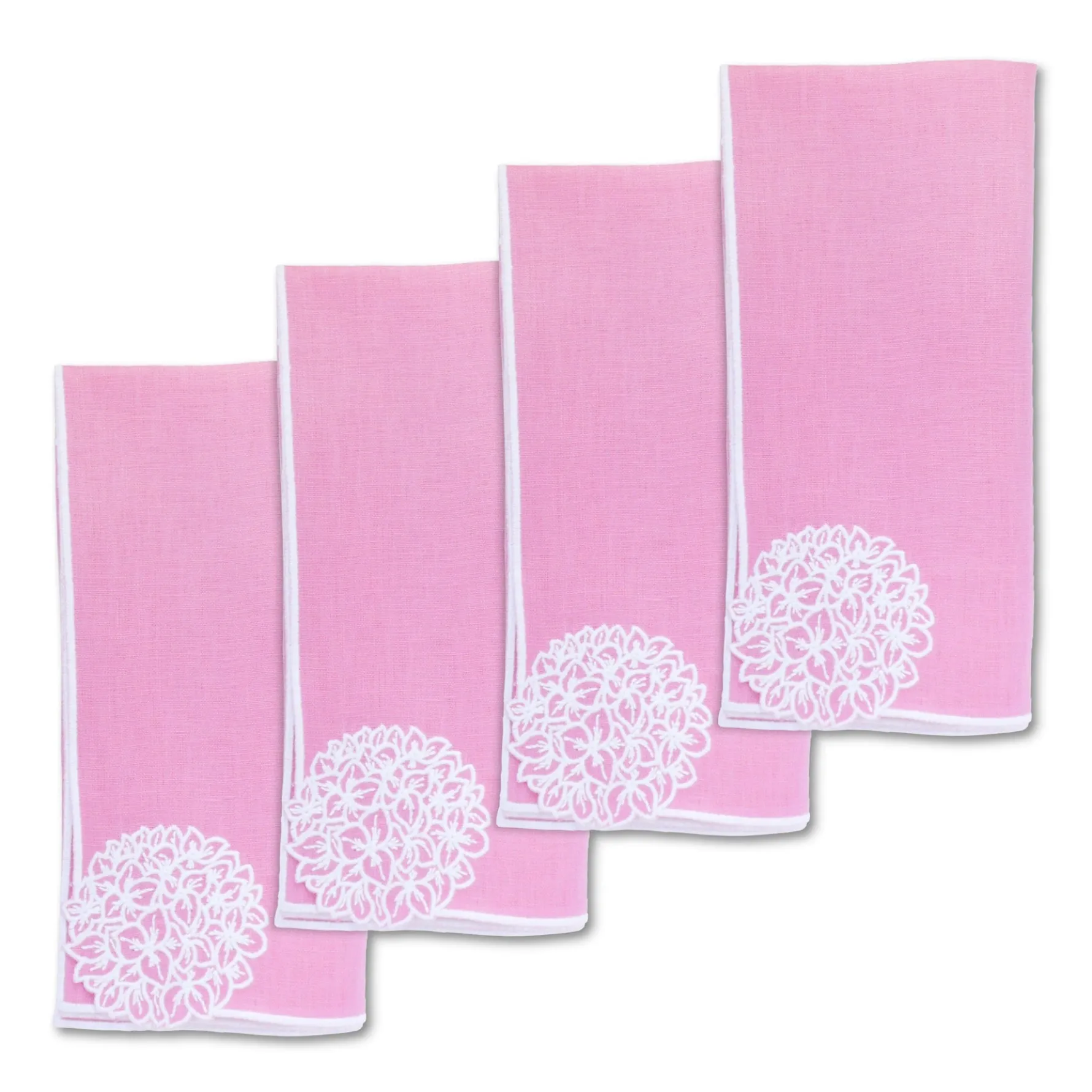 — Embroideredpink linen dinner napkins.