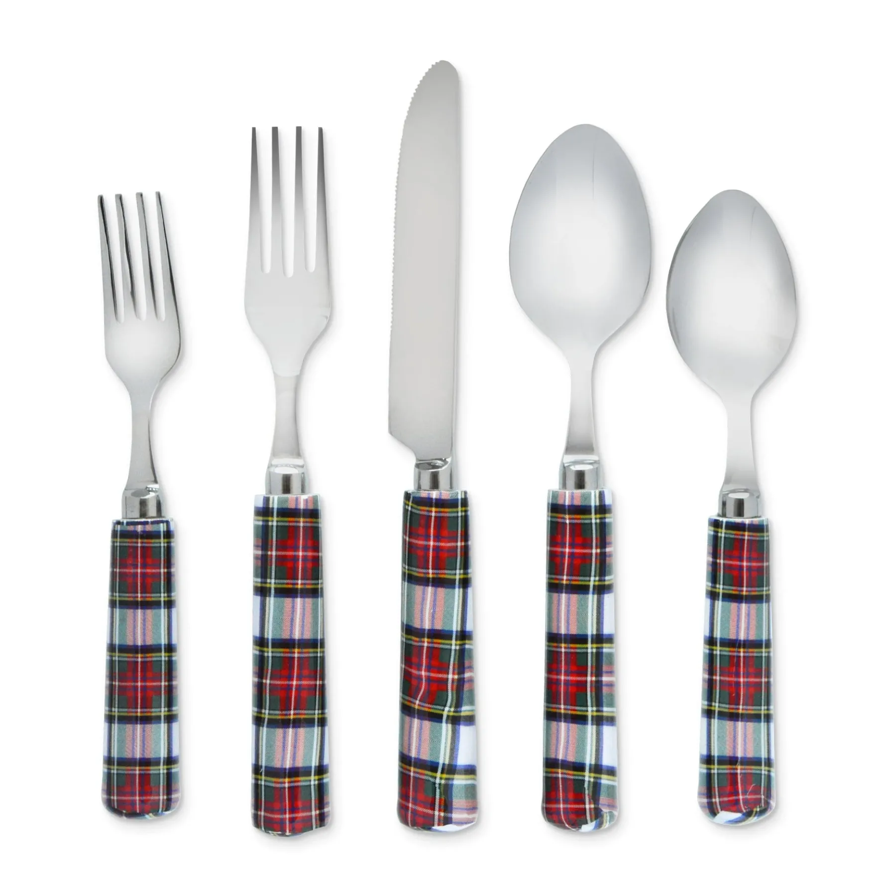 The most festive flatware! The handles are resin with a festive Christmas plaid pattern. The metal is stainless steel.