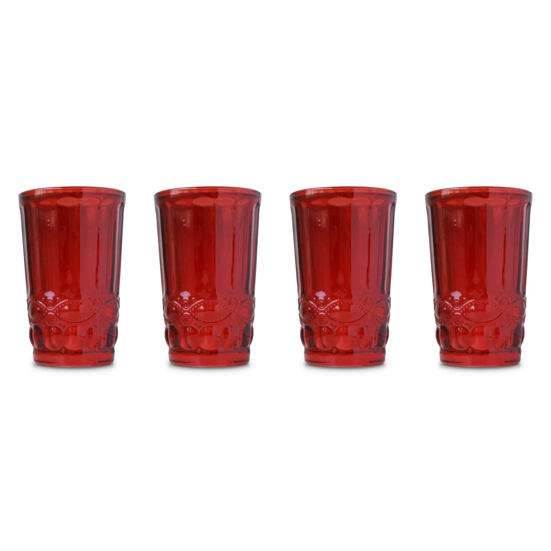 This set of 4 red drinking glasses is pressed with a decorative floral motif.