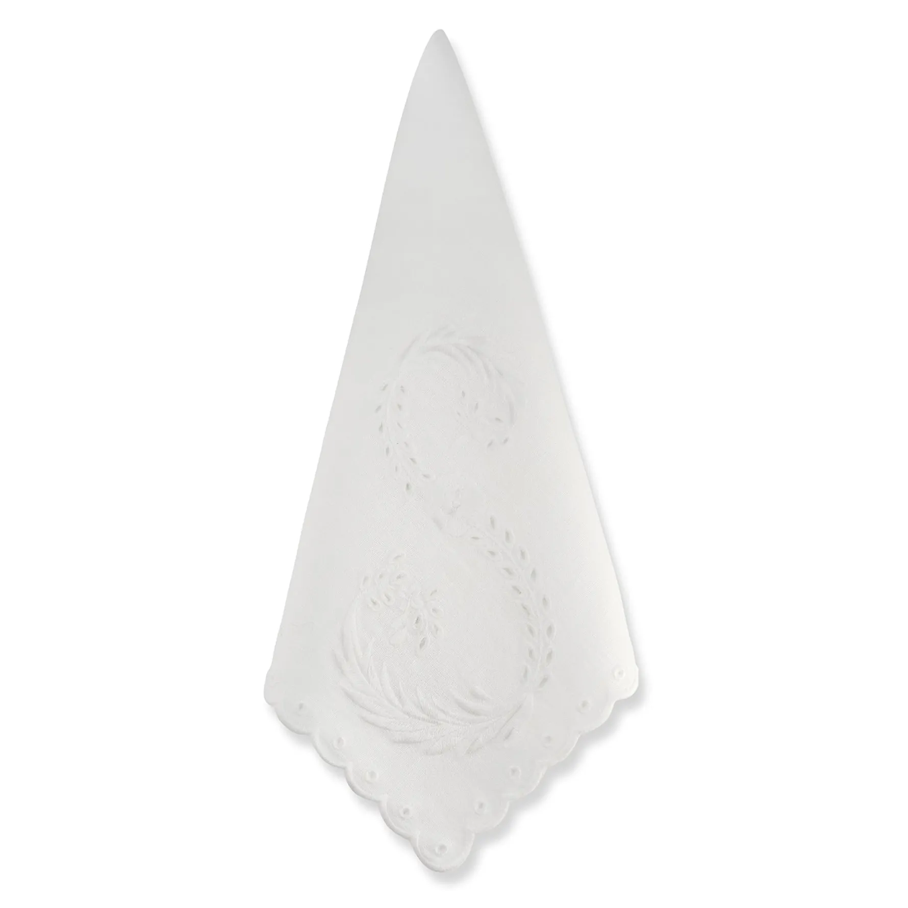 These white monogram initial dinner napkins bring the perfect personal touch to your dinner table. The letter ‘S’ is ornately embroidered with a cutwork technique and white thread. Beautiful for everyday use but special enough for a wedding.