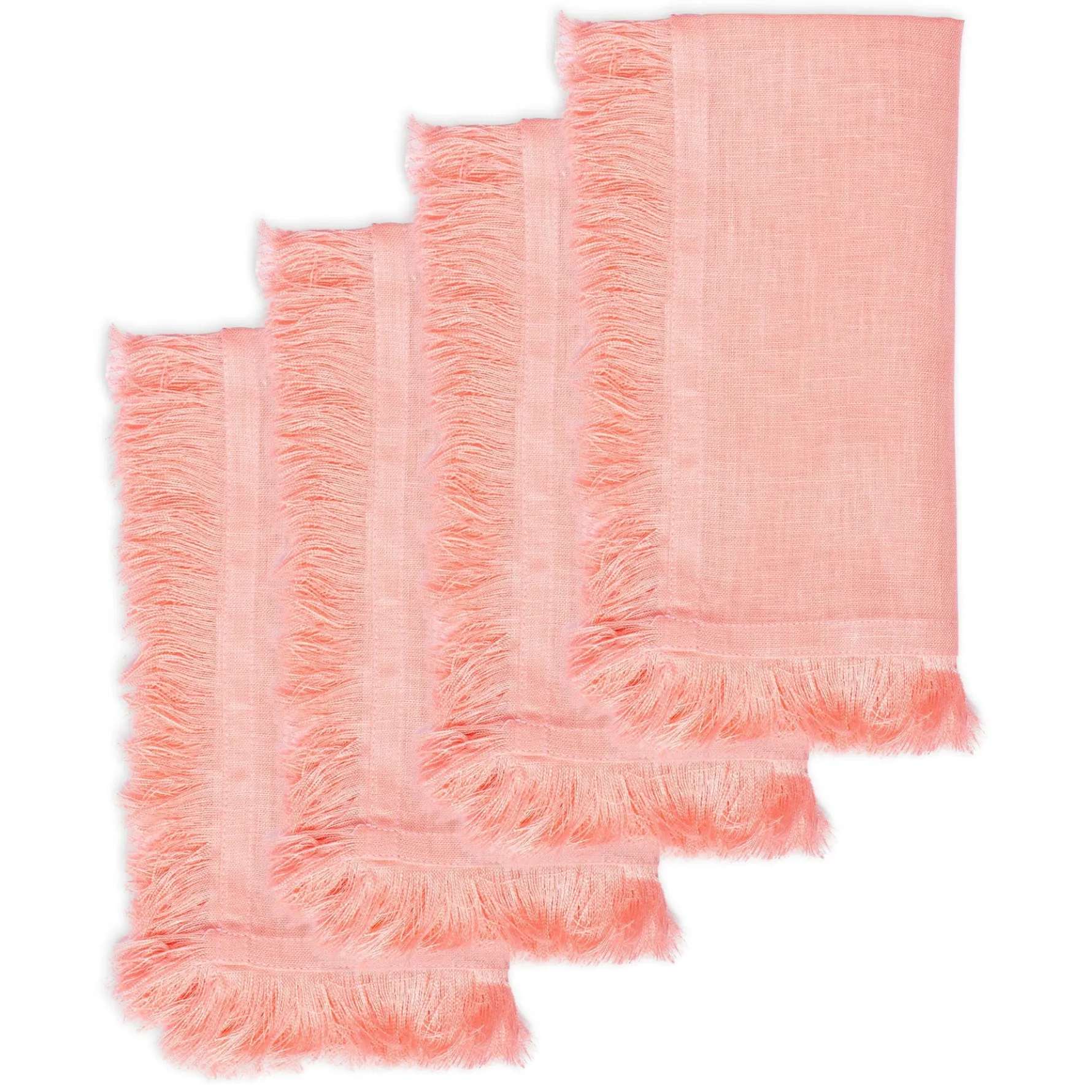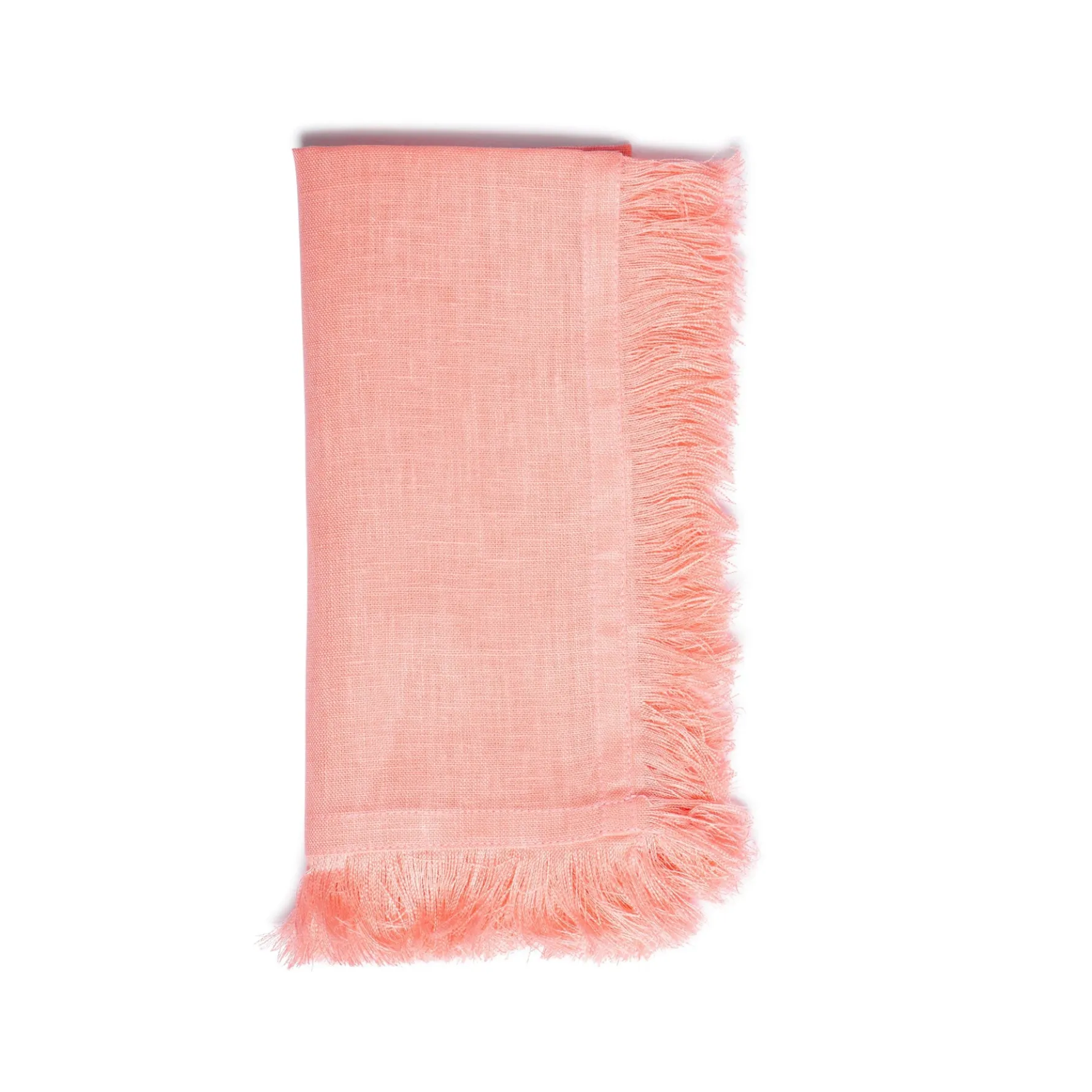 Pale salmon pink dinner napkins with a fringe edge. A colorway that works year round from Thanksgiving to Easter and back.