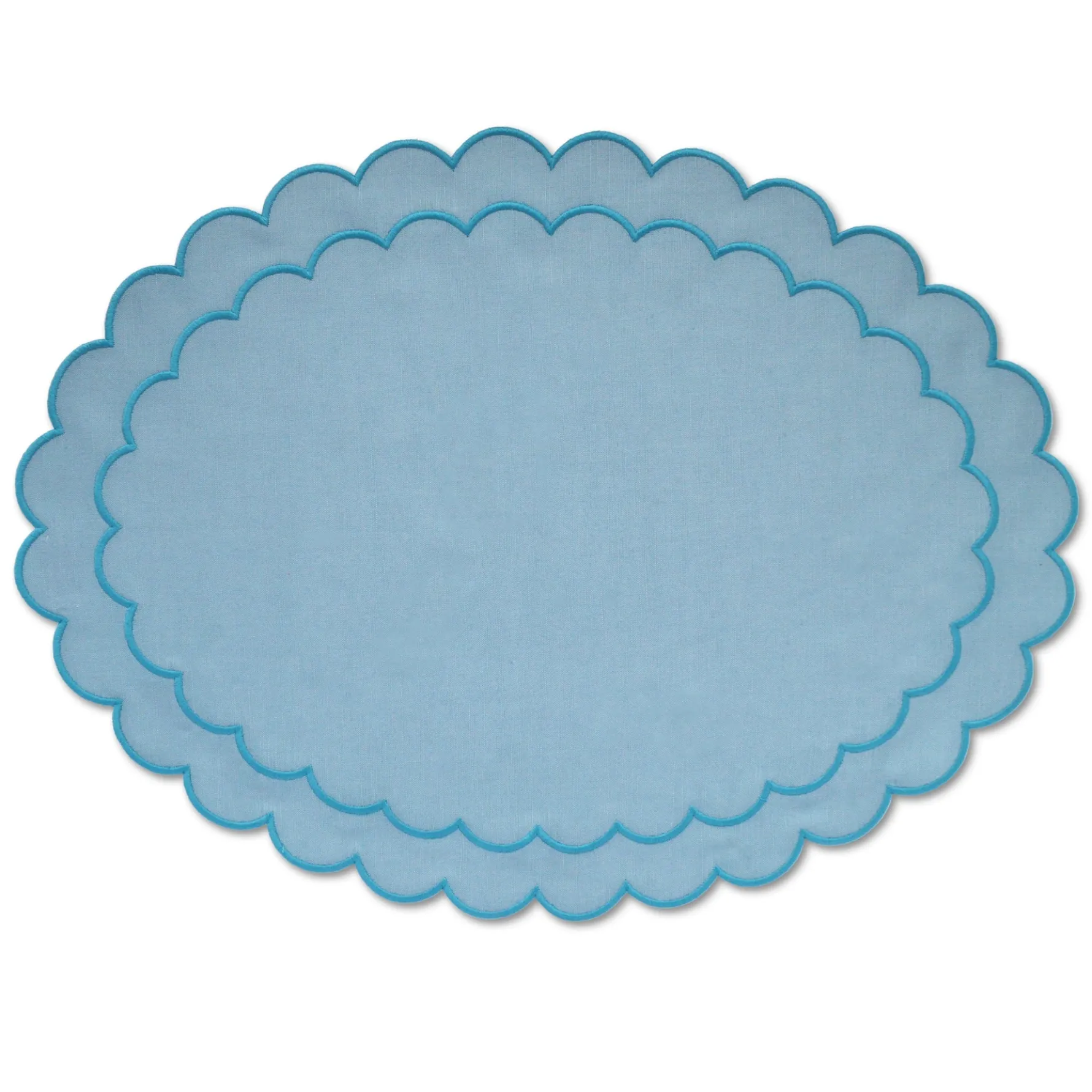 Theseteal placemats feature an embroidered border witha deeper colored threadona scalloped edge.