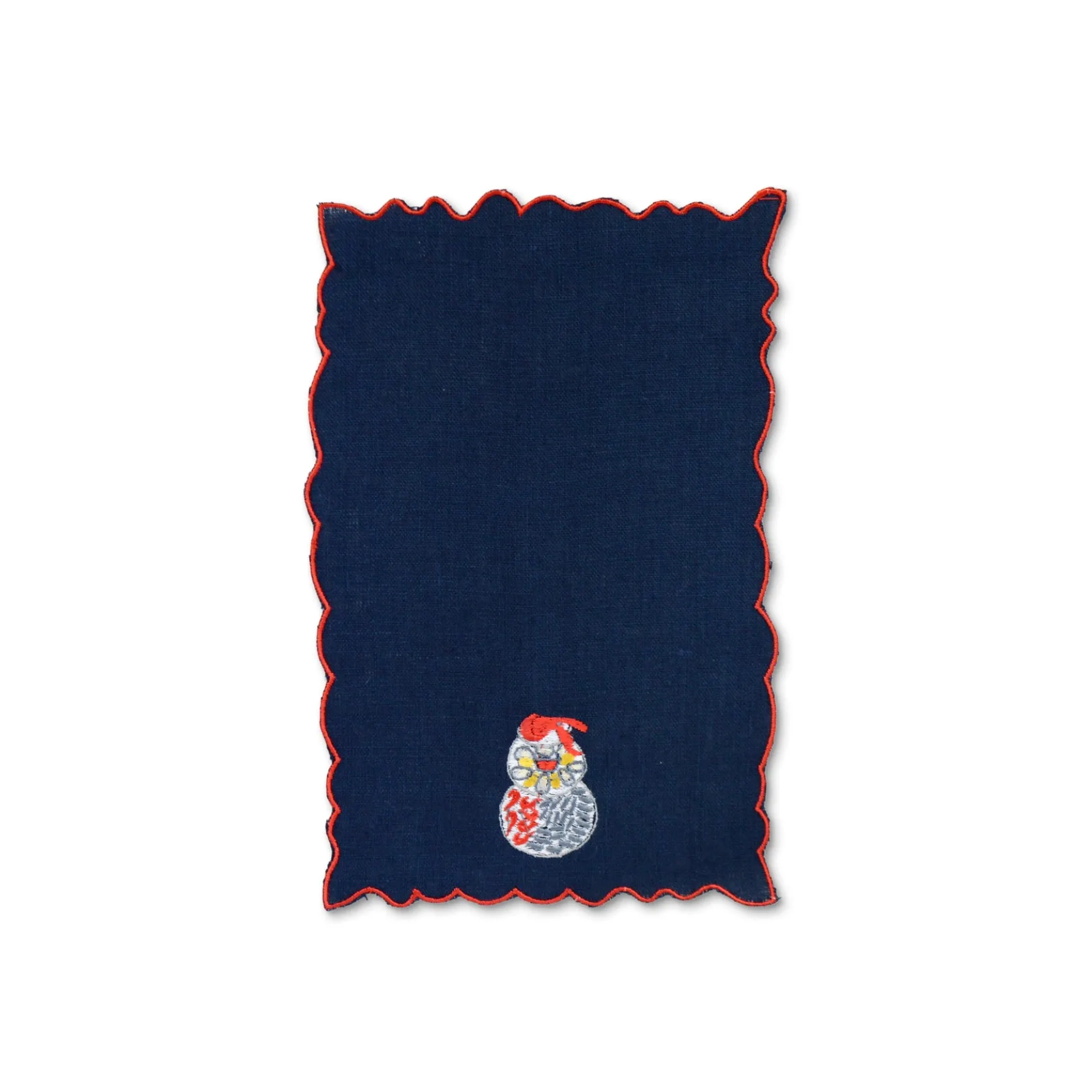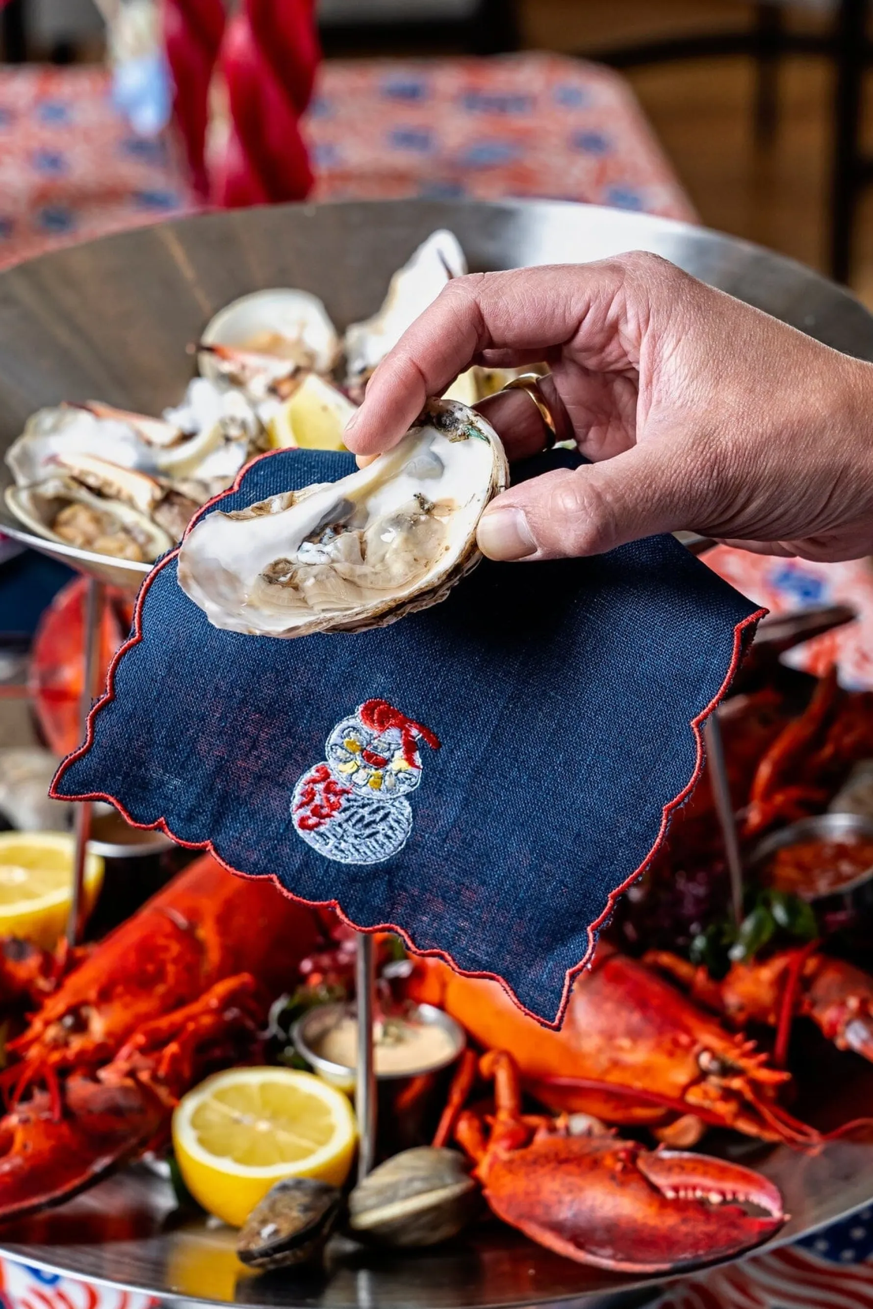 A rectangular cocktail napkin with an embroidery of a delicious raw bar of lobster, shrimp, and oysters.
