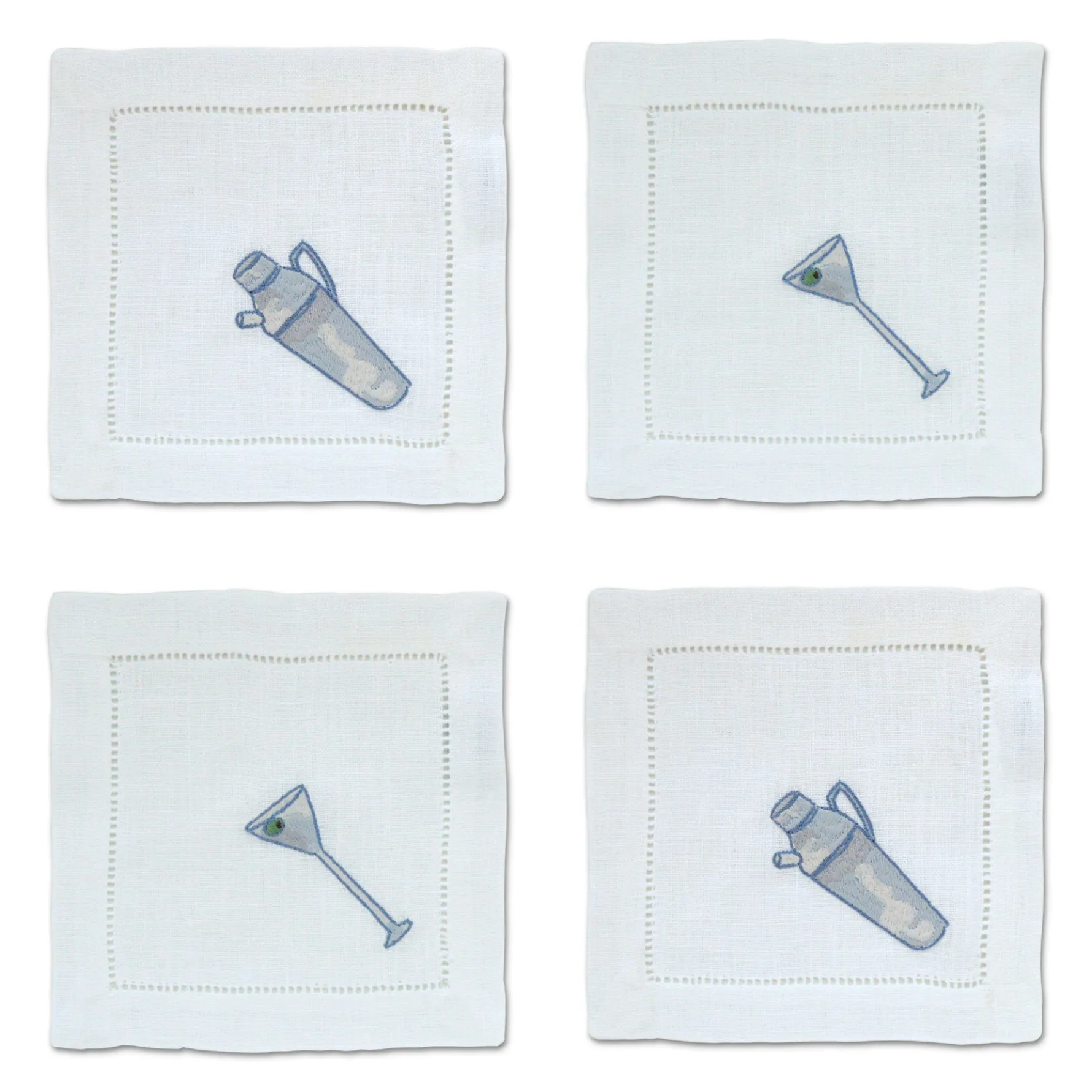 Cocktail napkins for martini lovers.Each set has 2cocktail napkins with martini embroideries and 2 cocktail napkins with shaker embroideries.