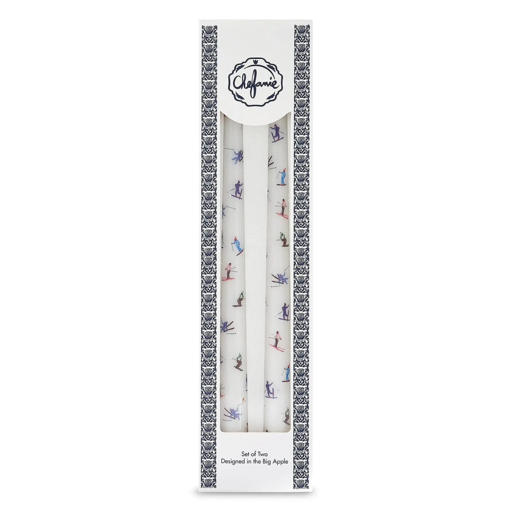 Athletic skiers race down this set of 2 unscented, white taper candles. Inspired by the view of the slopes from Ajax Tavern…