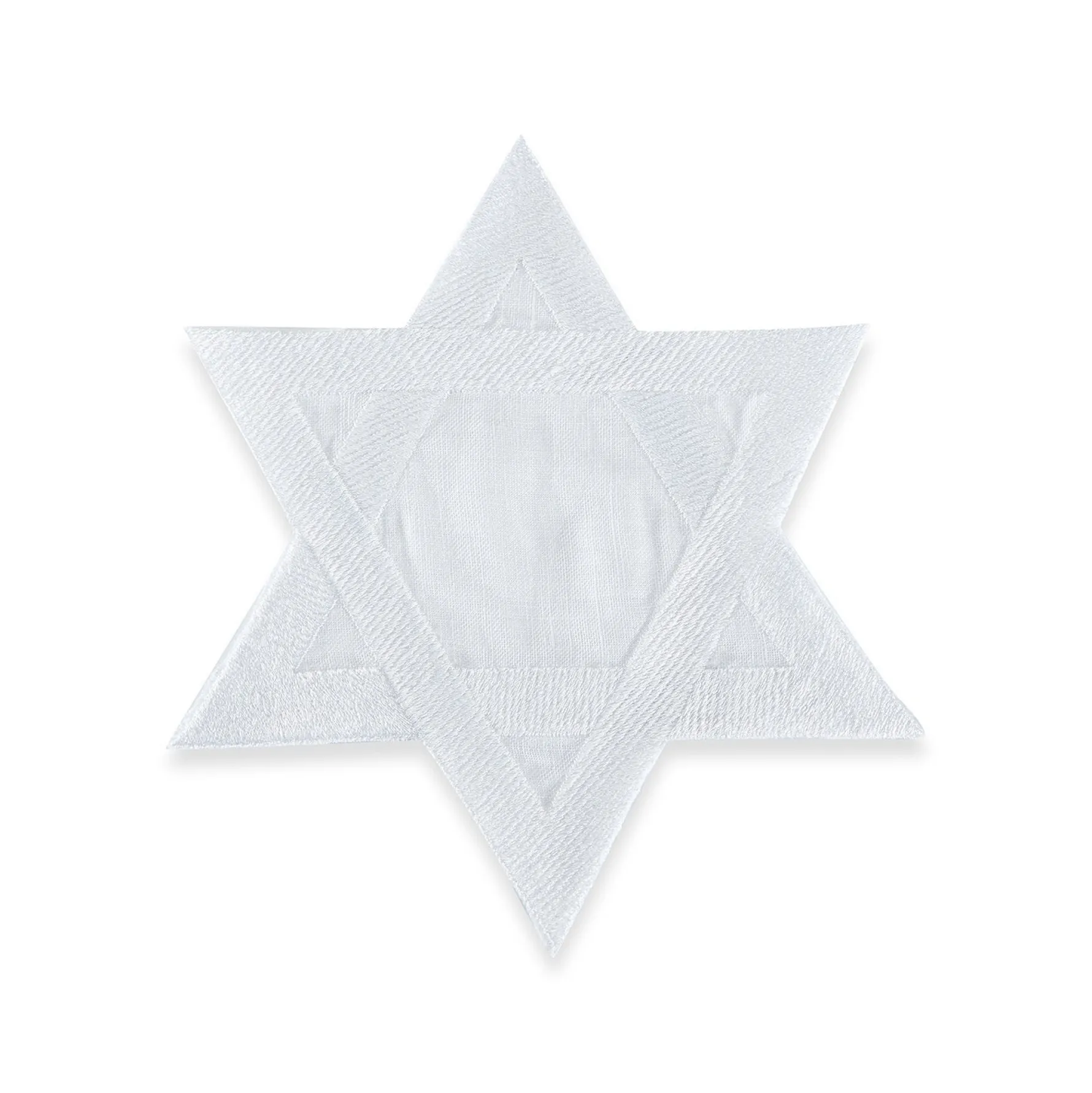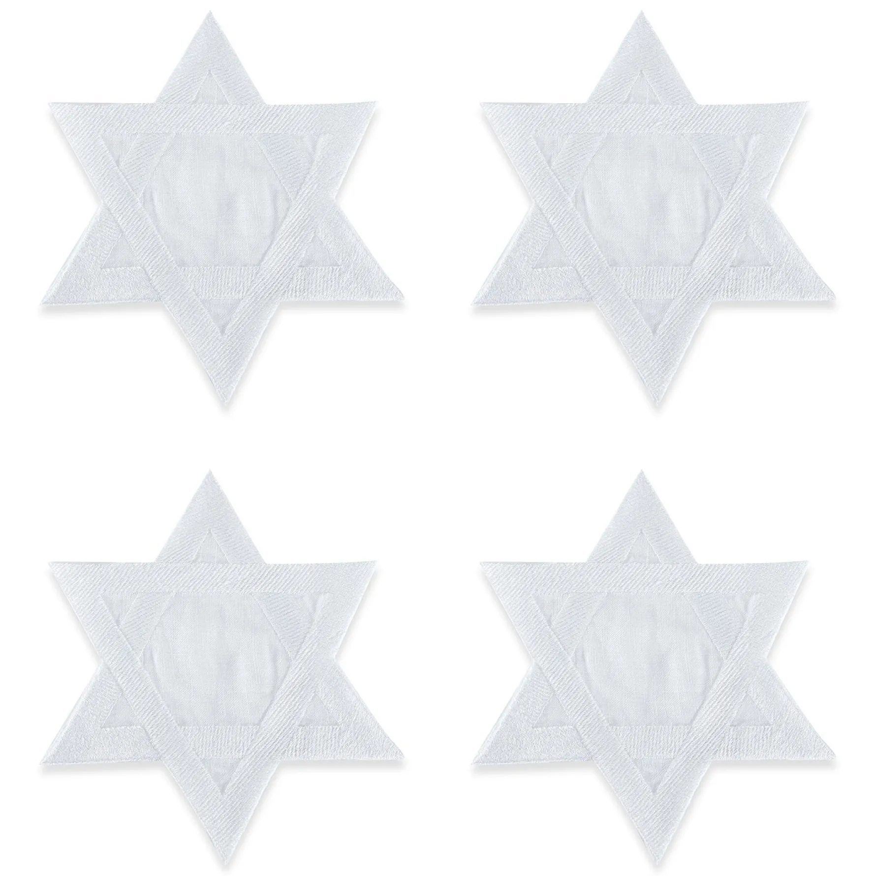 White Star of David-shaped linen cocktail napkins for Chanukah, Passover, Rosh Hashanah, or any other chag. Even the folks who have seen everything have never seen a latke served with a linen embroidered napkin in the shape of a Magen David
