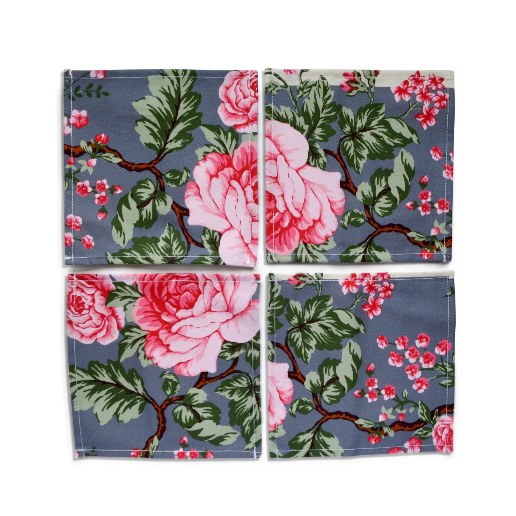 These rose patterned, rectangular cocktail napkins have navy blue stripes.