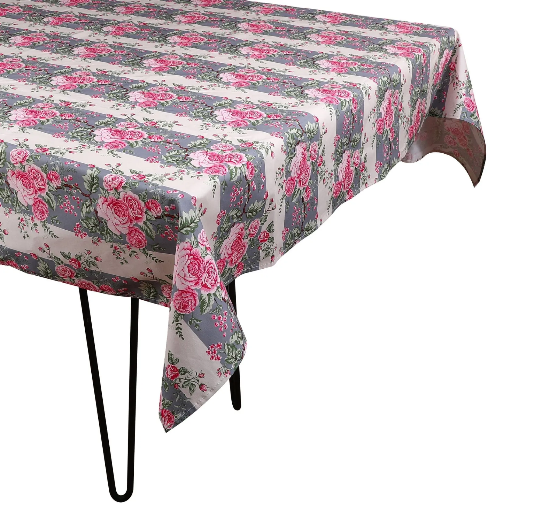 This rose patterned, rectangular tablecloth has navy blue stripes.