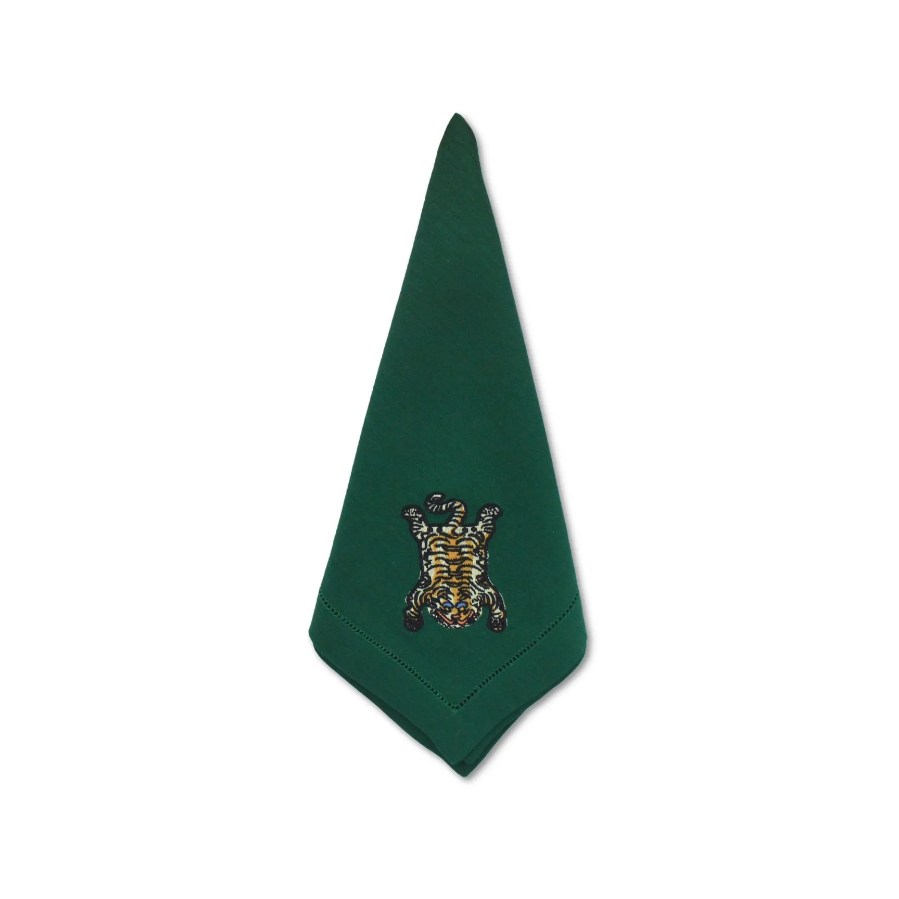 The auspicious tiger lies on these green linen dinner napkins. Lovely for holidays or special night at home.