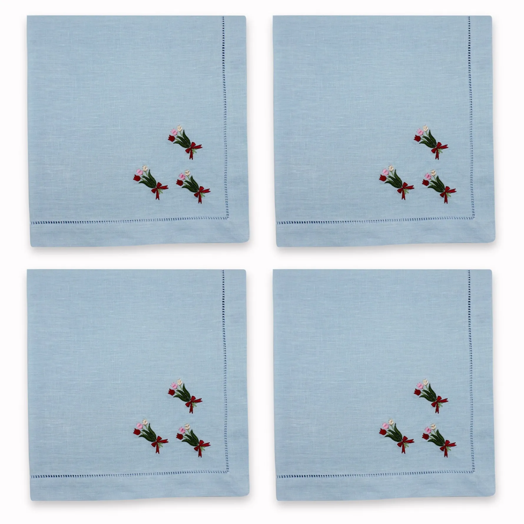 From Park Avenue to the Dutch countryside, tulips represent spring all over the world. 3 bouquets of the seasonal flower are embroidered onto blue linen with hemstitch border. The motif is perfect for spring entertaining: for Easter, Passover, or other occasions.
