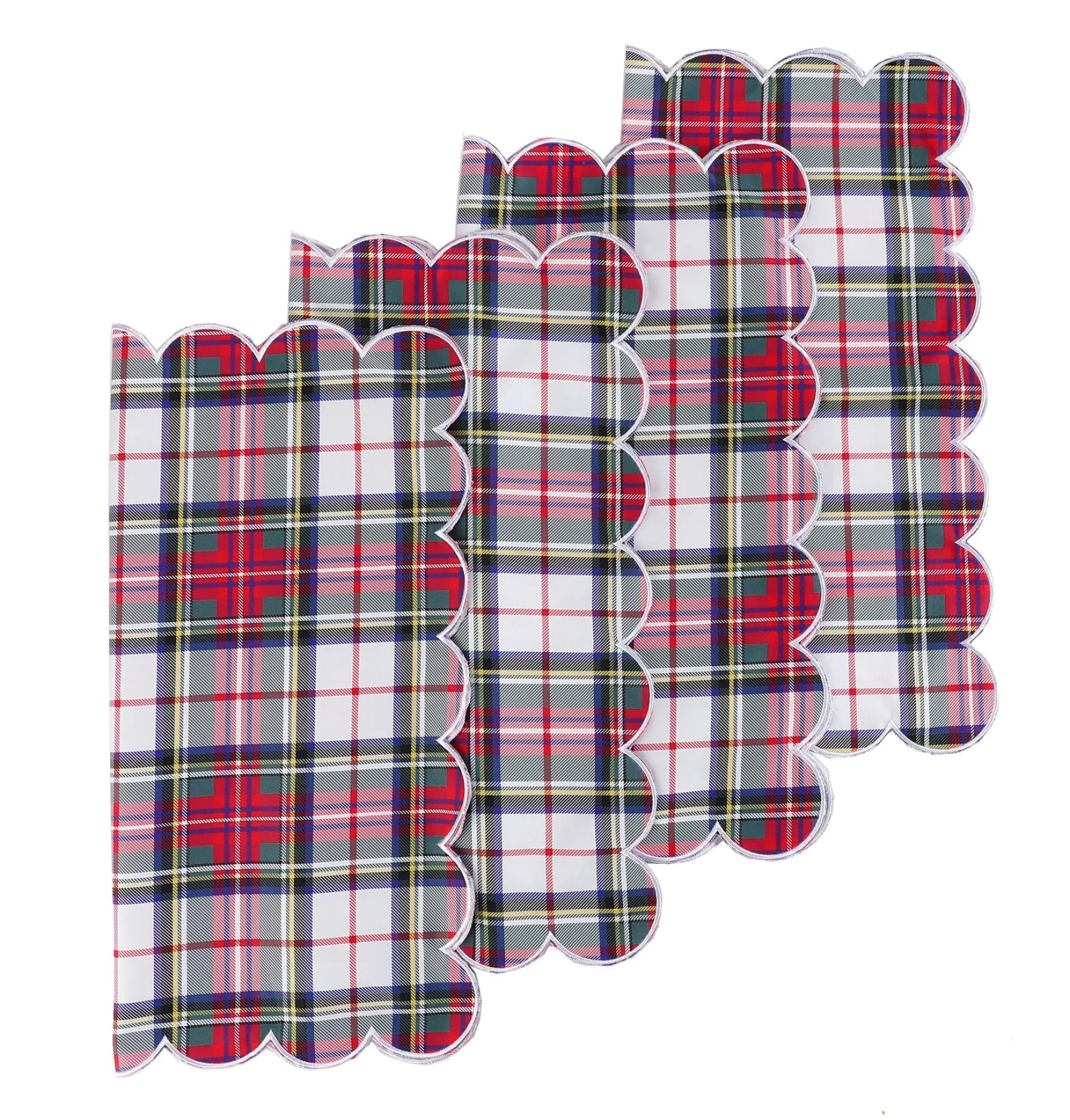 Our white plaid napkins will perk up your table setting. They can be used for casual breakfasts, tailgates, formal holiday dinners, and holiday parties. Each napkin has a scalloped edge.