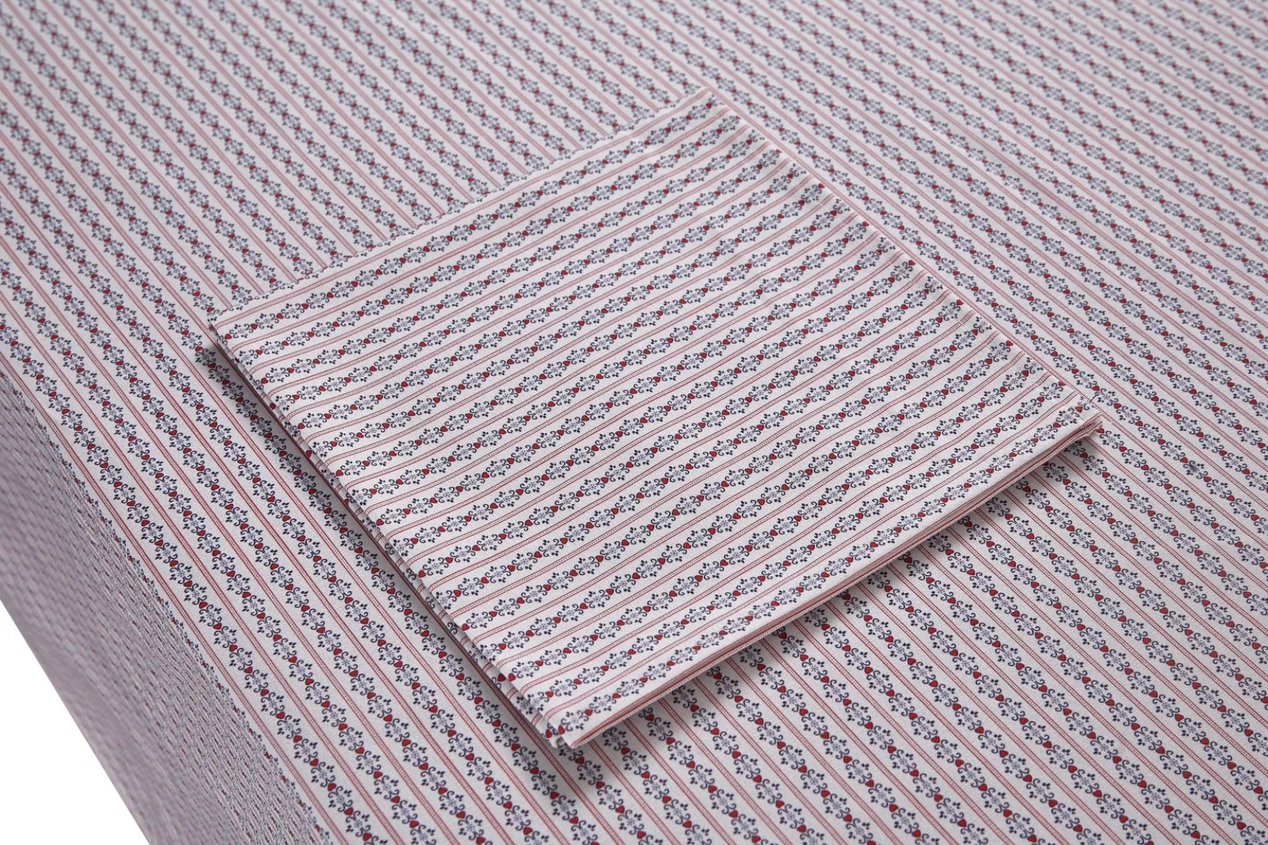 Inspired by vintage fabric, this red, white, and blueprinted tablecloth features small hearts and isa festive covering forJuly 4, Memorial Day, Labor Day