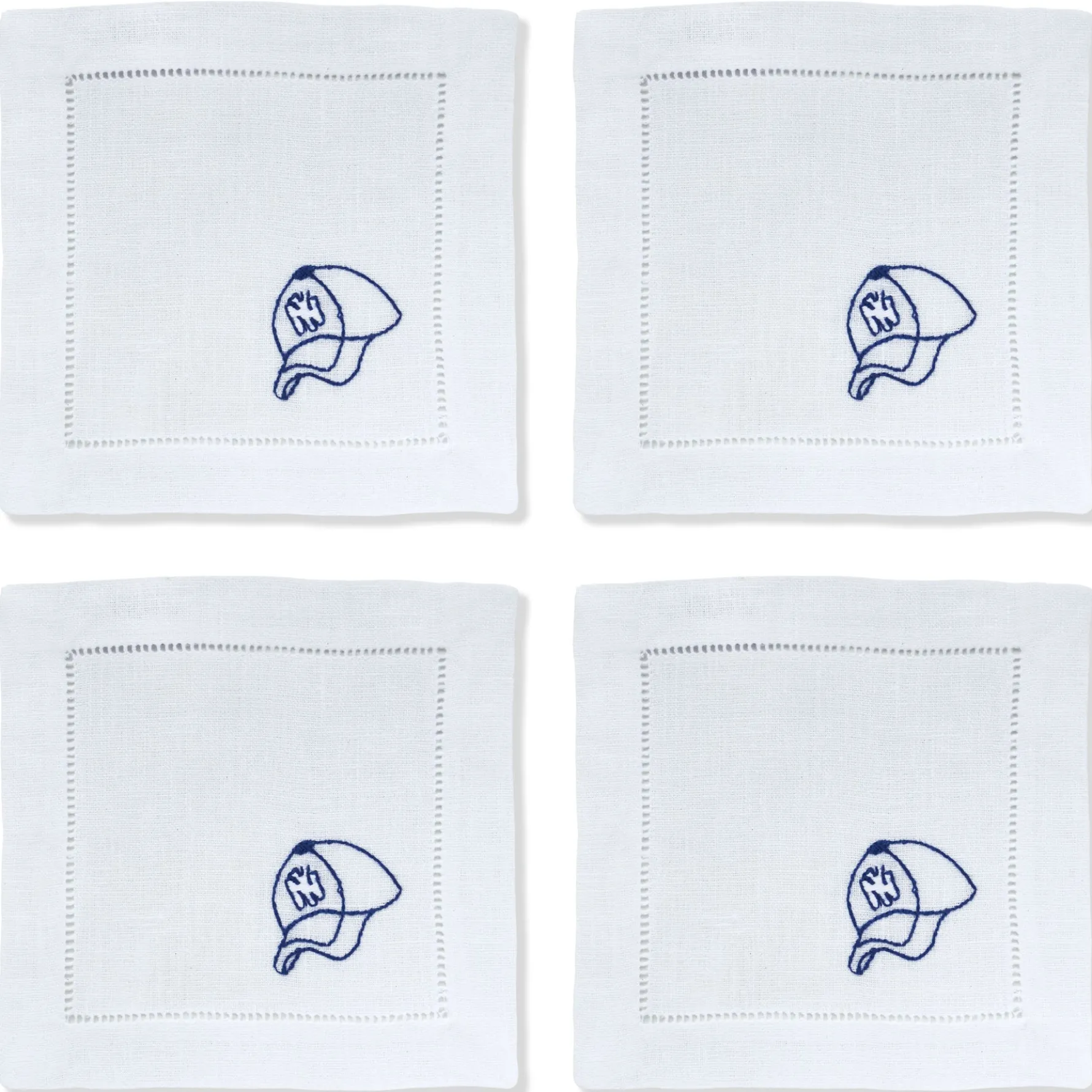 Cocktail napkins for New York Yankees fans. The corner embroidery depicts a Yankees hat with signature NY logo.